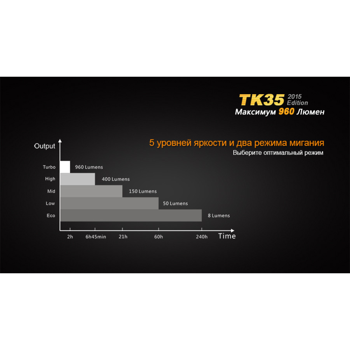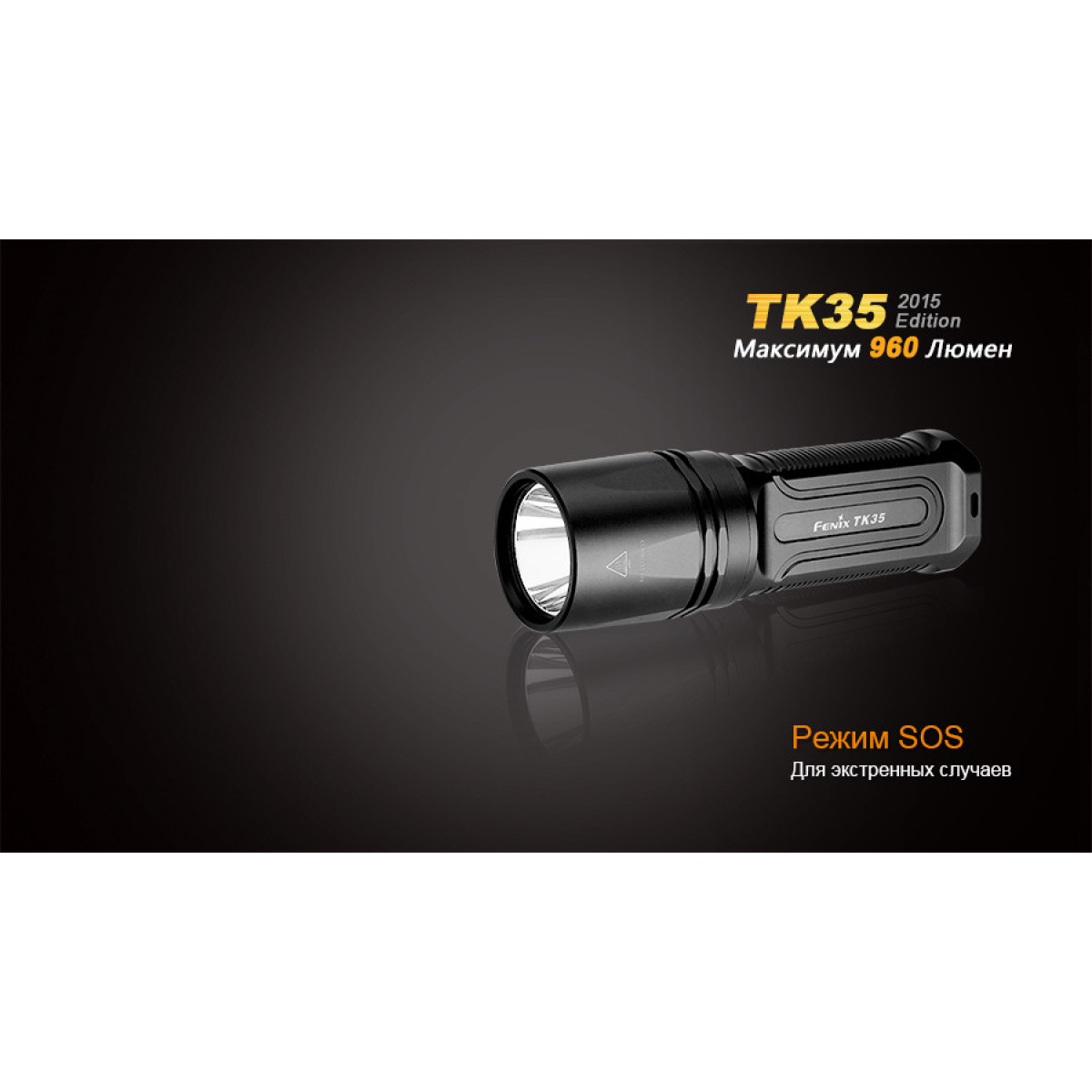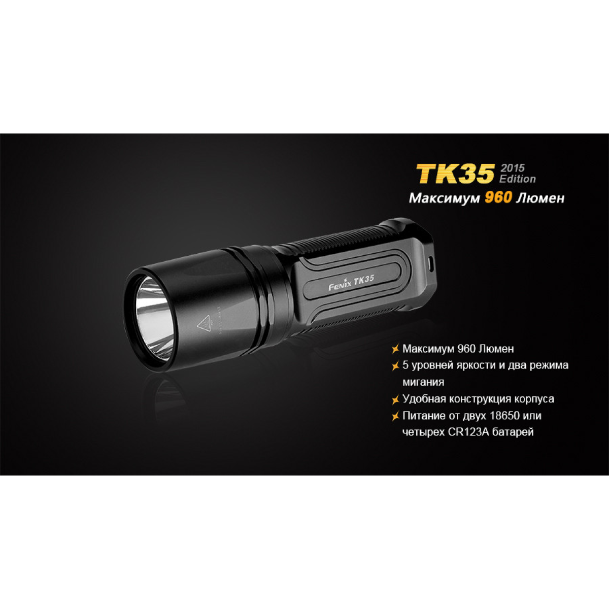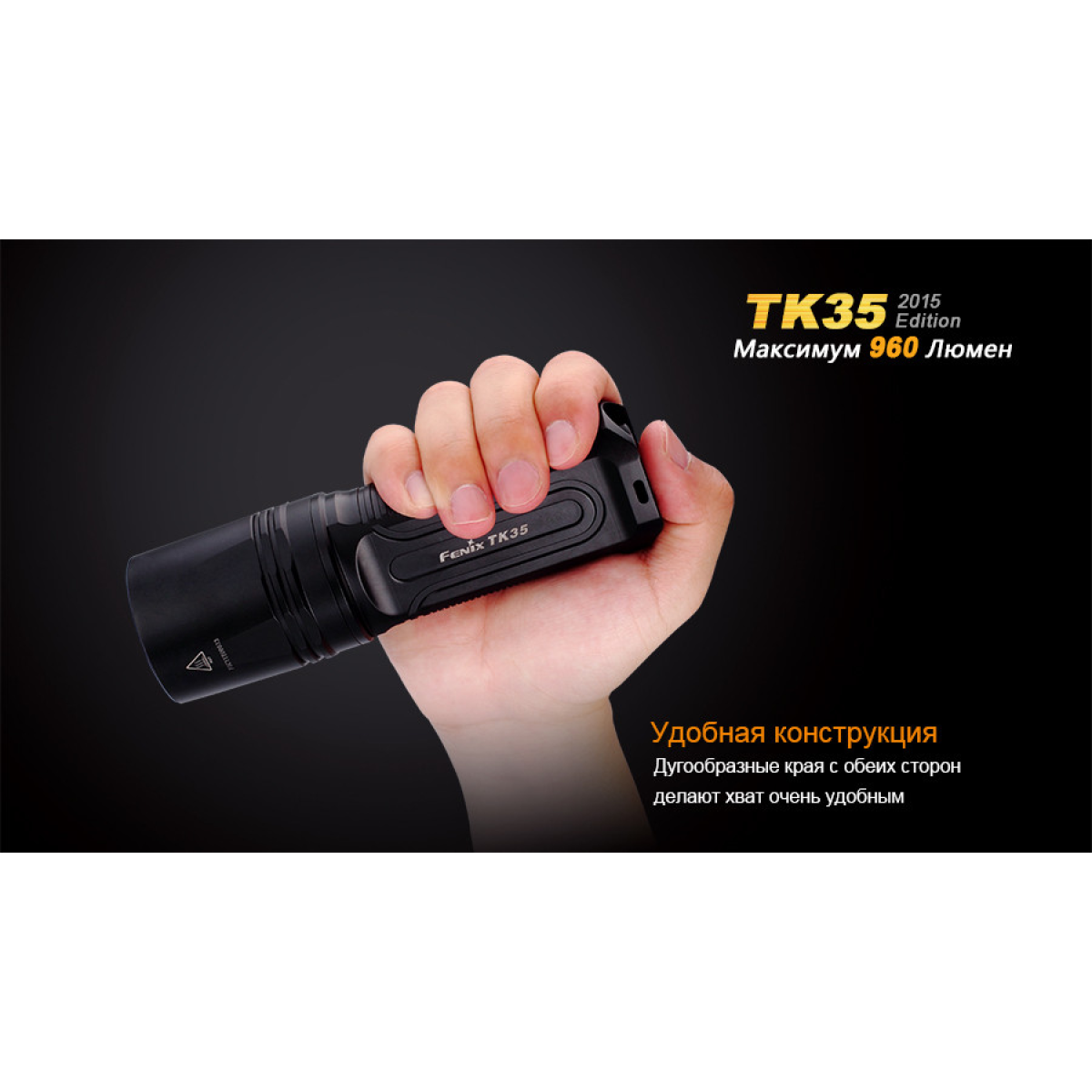 Ліхтар Fenix TK35 (2015 Edition) Cree XM-L2 (U2) LED ANSI Турбо Максимальний Середній Мінімальний Еко SOS Стробоскоп Яскравість 960 люмен 400 люменів 150 люменів 50 люменів 8 люменів 150 люменів 960 люмен Час роботи 2 години 6 годин 45 хвилин 21 година 60 годин 240 годин - - Дистанція 355 м Ударостійкість 1 м Водонепроникність IPX8, до 2-х метрів Розміри 159 мм (довжина) 43 мм (діаметр корпусу) 48 мм (діаметр голови) Вага 217 г (без елементів живлення) Комплектація Ліхтар, чохол, ремінець на руку, запасне кільце, гарантійний талон, інструкція Елементи живлення 2x18650 або 4xCR123A Тип відбивача гладкий Матеріал корпусу авіаційний алюміній Тип оптичної системи відбивач Покриття корпусу анодування III ступеня Паковання картонна подарункова коробка Включення кнопка в хвості Перемикання режимів кнопкою в хвості Опис ліхтарі Fenix TK35 2015 Edition: Для редакції 2015 року популярної моделі ліхтарі Fenix TK35 фахівці компанії-виробника вибрали яскравий і довговічний світлодіод Cree-XM-L2 (U2). Він забезпечує яскравість ліхтаря в діапазоні від 8 до 960 люмен. Робочий ресурс діода складає, щонайменше, 50 000 год. У порівнянні з моделлю Fenix TK35, в Fenix TK35 2015 Edition був доданий ще один робочий режим. Так, нова модель ліхтаря відкриває користувачам доступ до п“яти рівнів яскравості, а також миготливим режимам Strobe і SOS. Робочі характеристики в кожному з них наступні: Turbo: з яскравістю на рівні 960 люмен, заряду акумуляторів вистачить на 2 год роботи; High:з яскравістю на рівні 400 люмен, заряду акумуляторів вистачить на 6 год 45 хв роботи; Mid: з яскравістю на рівні 150 люмен, заряду акумуляторів вистачить на 21 ч; Low: з яскравістю на рівні 50 люмен, заряду акумуляторів вистачить на 160 год; Eco: з яскравістю на рівні 8 люмен, заряду акумуляторів вистачить на 240 год; Strobe: інтенсивні спалахи з яскравістю 960 люмен; SOS: 50 люмен яскравості миготливого світла. Дані про час освітлення в кожному з базових режимів роботи ліхтаря наведено з урахуванням експлуатації фірмових акумуляторів від Fenix стандарту 18650 - ARB-L2S. Акумулятори з іншими показниками ємності можуть забезпечити роботу ліхтаря відповідно зі своїми технічними характеристиками. Ліхтар Fenix TK35 2015 Edition в стані висвітлювати територію радіусом 355 м, що робить його придатним не тільки в туристичних походах, але і для проведення різних пошукових операцій. Також важливо згадати, що дана модель отримала декілька механізмів підвищення надійності роботи. Рівень освітлення стабілізується за допомогою цифрового контролера таким чином, щоб навіть частково розряджені акумулятори забезпечували заявлену яскравість в кожному обраному режимі до тих пір, поки для цього досить рівня їх заряду. Після подолання нижнього бар“єру заряду, ліхтар самостійно перемикається в наступних за рівнем споживання енергії режим. Про те, що батареї майже повністю сіли і їх потрібно замінити, попередить індикатор низького заряду. Корпус ліхтаря повністю виготовлений з міцного авіаційного алюмінію. Він також виконує роль механічного захисту від пошкоджень при експлуатації в польових умовах. Форма корпусу — приплюснута, з рифленою поверхнею з боків. За рахунок цього, ліхтар зручно лежить в руці і не вислизає з долонь. Крім того, оболонка ліхтаря повністю захищає його від попадання всередину вологи або пилу. Fenix TK35 2015 Edition має вищий рівень захисту від цих чинників - IPX-8. Особливості: - гранична яскравість - 960 люмен; - якісний світлодіод Cree XM-L2 