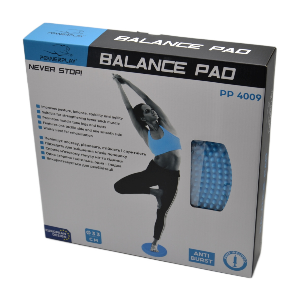 Призначення: для зайняти фітнесом удома і в тренажерному залі. Подушка балансир покращує тонус і функціональність м язів-стабілізаторів з допомогою нахилів, поворотів і динамічних вправ на нестабільній поверхні. Опис: БЕЗПЕЧНІСТЬ: Подушка PowerPlay виготовляється з використанням професійного класу PVC з системою Antyburst проти вибуху. Це дозволяє балансовим дискам тримати до 150 кг без ризику розриву та залишатися надутим протягом усіх тренувань або довгих годин, сидячи за столом. УНІВЕРСАЛЬНІСТЬ: Ця подушка для балансу працює як прекрасне сидіння для дітей, її можна непомітно використовувати на своєму офісному кріслі замість помітного фітнесу м“яча, щоб поліпшити поставу та допомогти впоратися з болями в спині, шиї та стегнах. Може бути введена в будь-який режим тренування для зміцнення і залучення мязів-стабілізаторів, поліпшення координації, допомоги у фізичній терапії та багато іншого. УНІКАЛЬНІ ТЕКСТУРОВАНІ ПОВЕРХНІ: Ми продумано розробили нашу подушку для крісла з протиковзною серцевиною з 2 поверхнями з різною текстурою. На одній стороні є невеликі нерівності, що чудово підходить для тих, хто шукає більш гладку поверхню для сидіння, тоді як на іншій стороні подушки, має більш виражені шипи, які чудово підходять для масажу вашої spini в сидячому положенні або для масажу стоп. Наша подушка для сидіння має діаметр 33 см і висоту 4 см, щоб легко поміститися на більшості стільців. Не містить фталатів або важких металів. Вправи на подушці дозволяють залучити всі групи м“язів, у тому числі й дрібні м“які м“язи-стабілізатори. Подушка балансир покращує тонус і функціональність мязів-стабілізаторів з допомогою нахилів, поворотів і динамічних вправ на нестабільній поверхні. З допомогою такої подушки виробляється координація, поліпшується реакція і зміцнюється постава. Також подушка-балансир дозволяє пом“якшити м язові болі, поліпшить кровообіг і самопочуття і тренувати м“які м“язи в домашніх умовах. Рельєф подушки впливає безпосередньо на стопу і підвищує мікроциркуляцію крові в тканинах, зміцнюються на м“язи та зв“язки стопи, поліпшується постава. Подушка-балансир підходить для будь-якого віку і будь-якого рівня підготовки. Застосування подушки сидячи: подушку необхідно покласти на стілець і рівно сісти на неї, щоб ноги були разом і ступні повністю торкалися підлоги. Застосування стоячи: Ставте стопу на поверхню повністю.