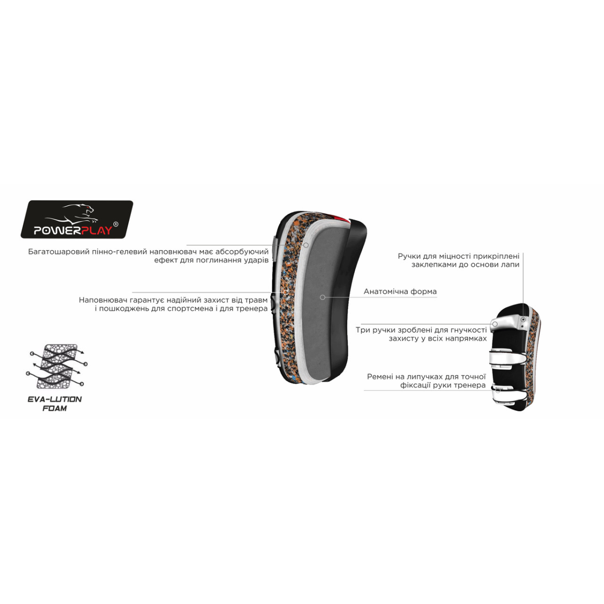 Призначення: Пади для тайського боксу PowerPlay 3064 призначені для тренувань з різних видів єдиноборств. Основна сфера їх використання – вдосконалення техніки ударів руками і ногами. Опис: Тай-педи PowerPlay 3064 виготовлені з високоякісної волової шкіри преміум класу. Мають довгий термін використання. Міцна волова шкіра, оброблена під високою температурою, впродовж довгого періоду часу зберігає свій вигляд навіть при інтенсивних навантаженнях. Основними якостями цієї шкіри є м“якість, еластичність. Анатомічна форма з трьома ручками зроблена для зручності вдосконалення ударів і гнучкості захисту у всіх напрямках. Ремені на липучках для точної фіксації руки тренера. Ручки для міцності прикріплені заклепками до основи лапи. Багатошаровий пінно-гелевий наповнювач має абсорбуючий ефект для поглинання ударів. Наповнювач гарантує надійний захист від травм і пошкоджень для спортсмена і для тренера. Маківара призначена для вдосконалення усіх видів ударів – прямі удари, хуки, аперкоти, поворотні та інші. Дає можливість вдосконалити удари руками, ногами, колінами, ліктями без обмеження в радіусі атаки. Також пади PowerPlay 3064 вирізняються стильним та сучасним дизайном. Продаються у парі.