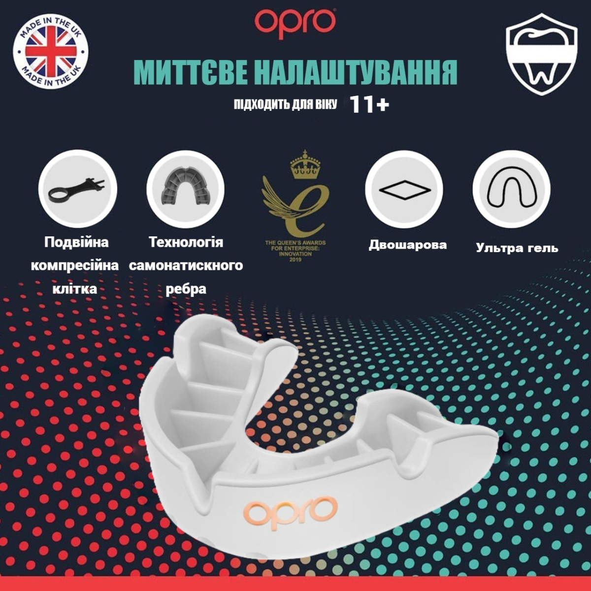 Підніміть тренування до максимуму. Отримайте покращений рівень захисту Bronze за допомогою OPRO. Одношарова конструкція розсіює ударні хвилі та зменшує загальну силу... щоб пом’якшити удар і зменшити травми зубів під час занять спортом. Грайте, щоб виграти, знаючи, що ваша посмішка захищена.