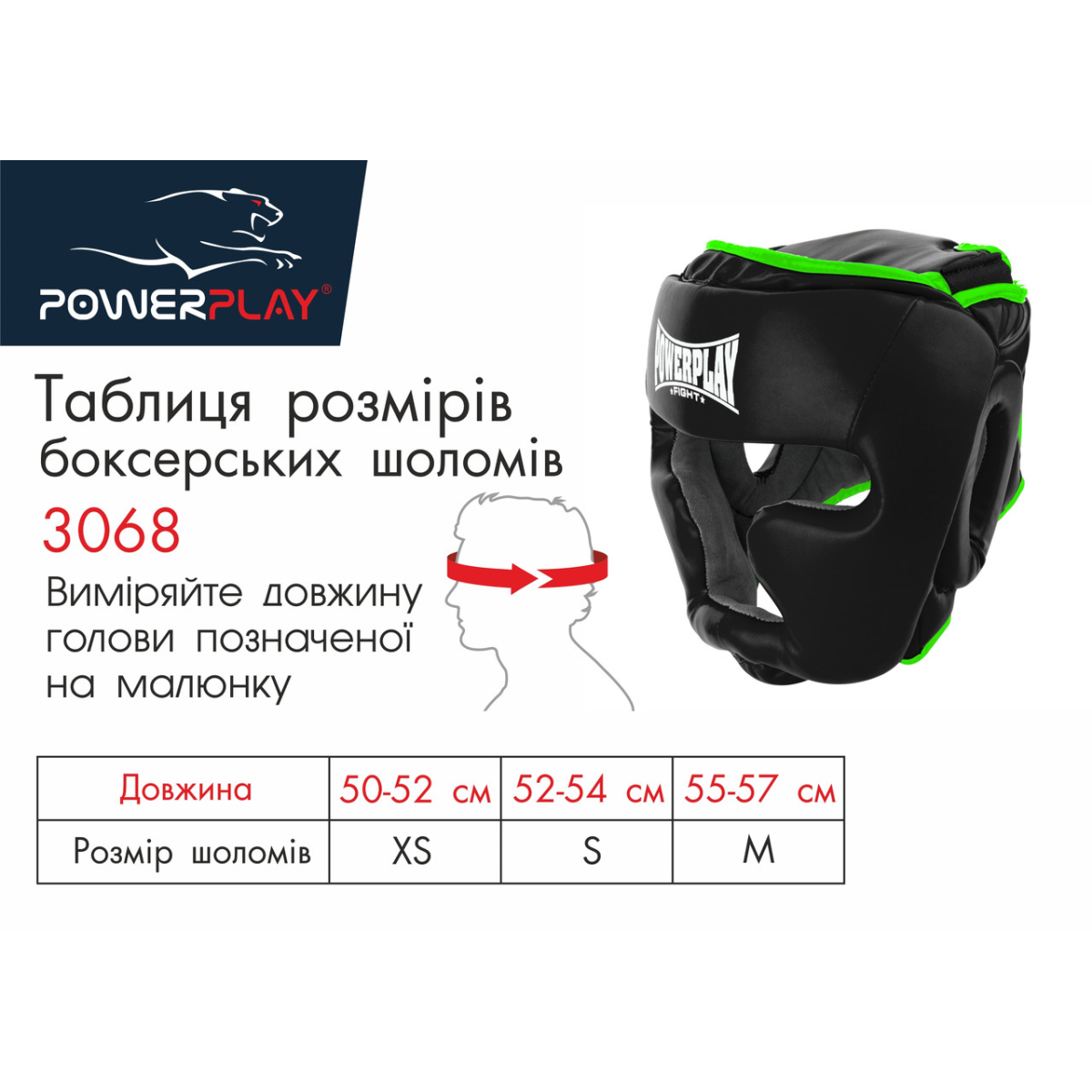 Призначення: Закритий шолом тренувальний PowerPlay 3068 використовується для тренувань з боксу та інших видів бойових мистецтв. Він оптимально підходить спортсменам для підготовчих спарингів і тренувальних боїв. Гарантує найкращий захист голови спортсмена. Шолом підійде для бійців різного віку і рівня підготовки. Ідеально підійде для дітей. Опис: Боксерський шолом PowerPlay 3068 виготовлений з міцної синтетичної шкіри високого класу на основі поліуретану (PU), яка має ідентичну структуру натуральній шкірі. Поліуретанова шкіра вважається еко-шкірою – вона не викликає алергії у людей. Серед переваг такого матеріалу – стійкість до механічних пошкоджень (не рветься і не дряпається), еластичність, тривалий термін використання. Стійкий до ударів внутрішній багатошаровий пінно-гелевий наповнювач, відмінно поглинає силу ударів. Завдяки анатомічній формі шолом цієї моделі щільно прилягає до голови. Комфортному приляганню допомагають гумки на верхній частині шолома. Забезпечує широкий кут огляду, що вкрай важливо для успішного проведення бою. Шолом надійно захищає голову, має додатковий захист на вилиці, щоки, маківку, потилицю і підборіддя. Додаткові вушні протектори надійно захищають вухан від травм. Підгонка моделі здійснюється з допомогою застібки-липучки на тильній частині, що гарантує надійну фіксацію. Внутрішня частина шолома виготовлена із високоякісної замші AMARA, не ковзає, приємна на дотик. Підкладка легко чиститися, не втягує запах. Завдяки отворам зверху голова відмінно вентилюється. Окрім високих функціональних характеристик, боксерський шолом PowerPlay 3068 вирізняється стильним дизайном. Враховуючи те, що бокс та інші види єдиноборств вважаються найбільш травмо-небезпечними видами спорту, шолом для спортсмена є одним із найнеобхідніших елементів спорядження. Згідно статистики, під час боксерського поєдинку протягом одного раунду суперники наносять один одному 30-40 прицільних ударів, із яких 40% спрямовані в голову. Тому правильний вибір шолома – одна із запорук безпеки під час проведення поєдинку. Розмір шолома підбирається залежно від довжини окружності голови. Розмір XS S M Обхват голови 50-52 див. 52-54 див. 55-57 див.