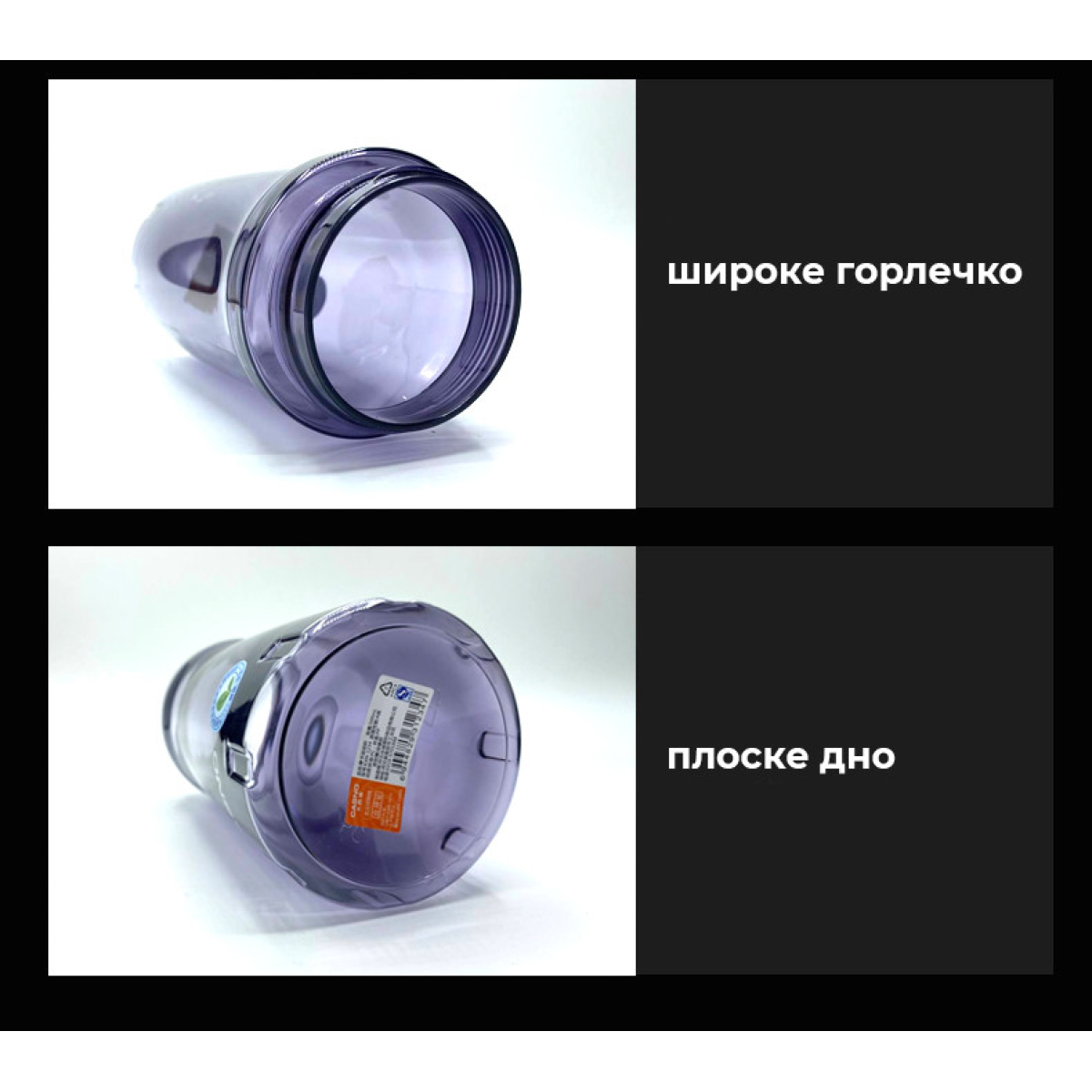 Отвір достатньо широкий, щоб використовувати пляшку як шейкер, змішувати напої, кидати всередину кубики льоду.