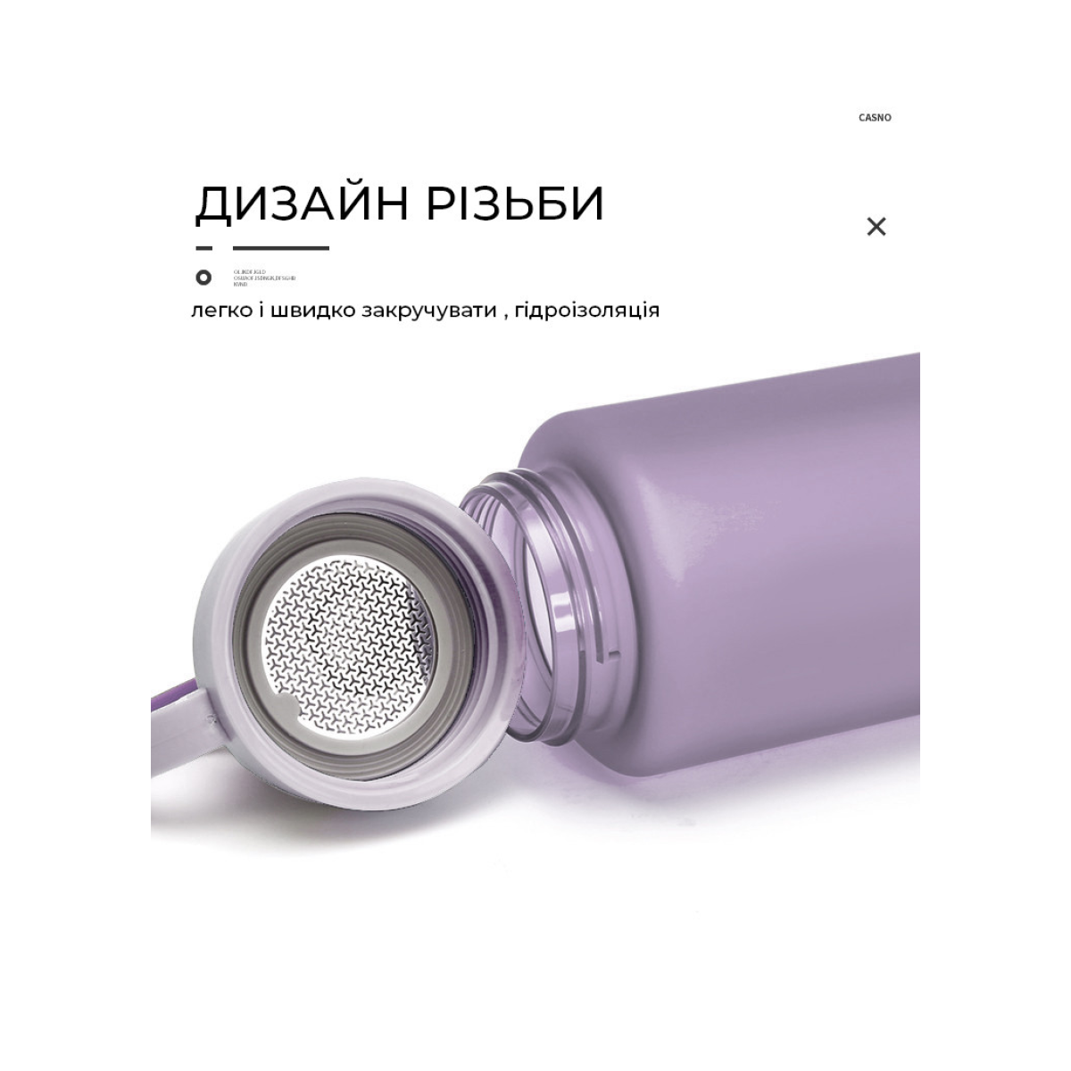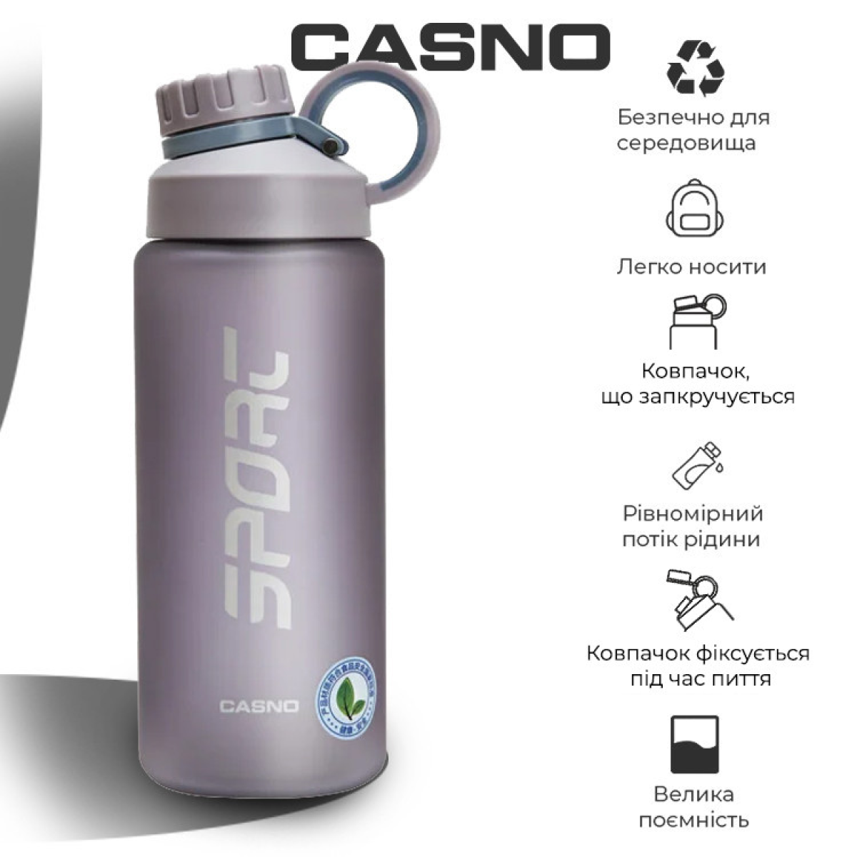 Casno – пляшка для води, виготовлена з якісного Р7 поліефірного пластику, вона не має стороннього запаху, зручна у використанні, не шкідлива для здоров’я. Вона ідеально підходить для піших прогулянок, їзди на велосипеді, для кемпінгу, трекінгу, бігу, йоги та будь-яких інших видів спорту вдома, у тренажерному залі та в офісі.