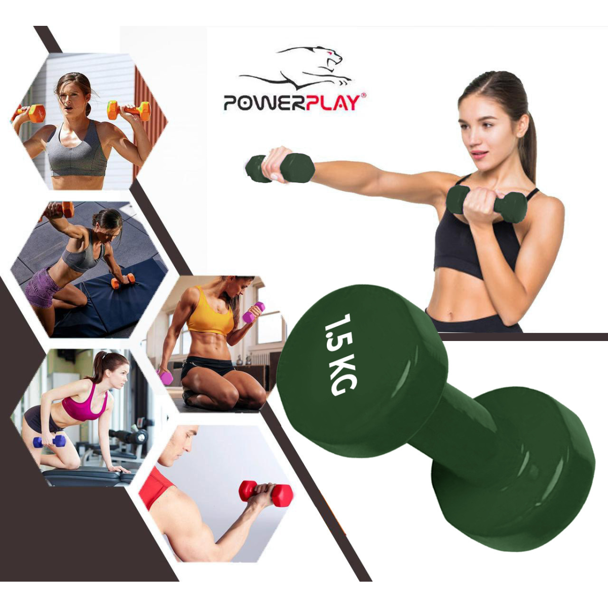 Призначення: для занять фітнесом вдома і в тренажерному залі. Комплект 2 шт. по 1,5 кг. Це просте обладнання, яке можна використовувати як вдома, так і в тренажерному залі. Завдяки гантелям PowerPlay ви зміцните і сформуєте м“язи рук, передпліч та грудей. Вінілові гантелі підходять для аеробних, силових і витривалих тренувань. Також їх часто використовують у реабілітаційних клініках. Гантелі також є простим способом привести ваше тіло в тонус. Тому цей вид техніки частіше вибирають дами. Невеликі гантелі, які використовуються під час вправ, дозволяють повністю зосередитися на техніці вправи. Використовуючи обважнювачі, ви швидко побачите ефект зміцнення, а ваш силует придбає новий вигляд. Опис: Гантелі ‒ незамінні снаряди для тренування м“язового каркаса людини. Ідеальний розігрів - наші гантелі чудово підходять для розминки та загальних вправ, щоб змусити ваші м’язи розігрітися. Чудово підходять для тренувань верхньої частини тіла, допомагають розвивати дельтоподібні, грудні м“язи, трицепси та біцепси. Гантелі також чудово підходять для збільшення витривалості. Використовуються в фітнесі, бодибілдингу, функціональному тренінгу (в тому числі CrossFit), лікувальній фізкультурі. Чудово підходять для інтенсивних тренувань, таких як ходьба, біг підтюпцем, аеробіка тощо. Сталева гантель з барвистим вініловим зовнішнім покриттям із полівінілхлориду для міцного, нековзного зчеплення. На відміну від звичайних гантелей, вони ідеально підходять для тренувань в домашніх умовах, оскільки не дряпають підлогу і мінімізують шум від зіткнення з нею. Поверхня гантелі надзвичайно зносостійка та легко миється. Також ці снаряди приємні на дотик, не холодні в долонях і виконані в яскравій кольоровій гамі. Гідний подарунок для всіх любителів фітнесу, від новачків до людей похилого віку. Гантелі PowerPlay можна використовувати під час роботи, силових тренувань, бойових мистецтв і навіть під час повсякденних справ. Ви самі вирішуєте, наскільки ви хочете втомитися і скільки триватиме тренування;). Гантелі підходять для розвитку динаміки, сили й витривалості, а також допомагають спалювати калорії. Специфікація: Матеріал: Чавун Вага: 1,5 кг Колір - Темно зелений Кількість штук в наборі: 2 шт. Форма: класична Технічний опис: Ефективний і практичний інструмент для вправ Покращує динаміку, витривалість і силу Це допомагає вам спалити зайві калорії Це допомагає зменшити жир Ідеально підходить для тренувань на свіжому повітрі, єдиноборств, повсякденного носіння та інших видів діяльності Застосування : Аеробні Фітнес Сила Витривалість Реабілітація Ідеальне доповнення до домашнього тренажерного залу Технічна специфікація: Комплект 2 шт. по 1,5 кг. Матеріал: чавун, покрита вінілове Загальна довжина: 15,5 см Довжина ручки: 8,7 см Ширина: 6 см Зручний хват Ергономічна класична форма Крім того, їх можна використовувати як опори для віджимань Естетичність і точність виконання