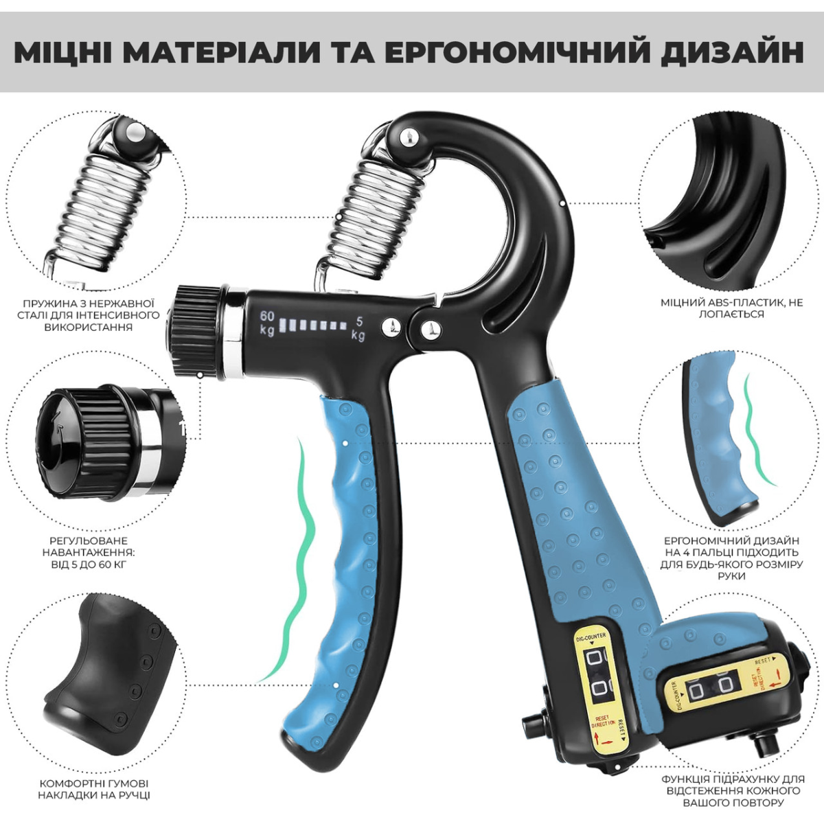 Еспандер кистьовий з лічильником PowerPlay PP-4402 з регульованим навантаженням 10-60 кг. Синій