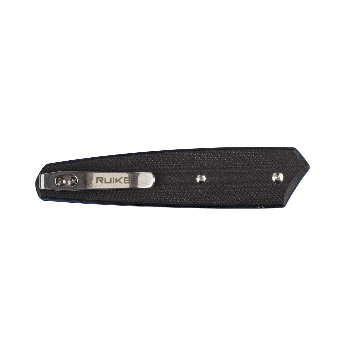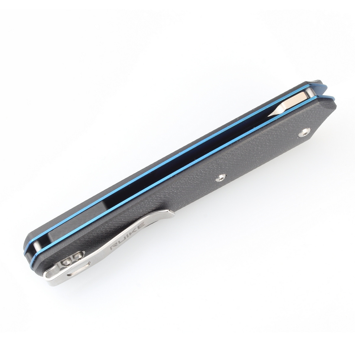 Рукоять ножа Ruike P848-B складається з декількох частин, а саме, з пари сталевих лайнерів (нержавіюча сталь марки 420 + титанове покриття синього кольору) і двох накладок з G10 чорного кольору. Якісна обробка і ретельна підгонка комплектуючих один до одного дозволили зробити рукоять максимально цілісної і зручною для користувача. А текстурована поверхня накладок з G10 не дасть ножу вислизнути з рук при експлуатації.