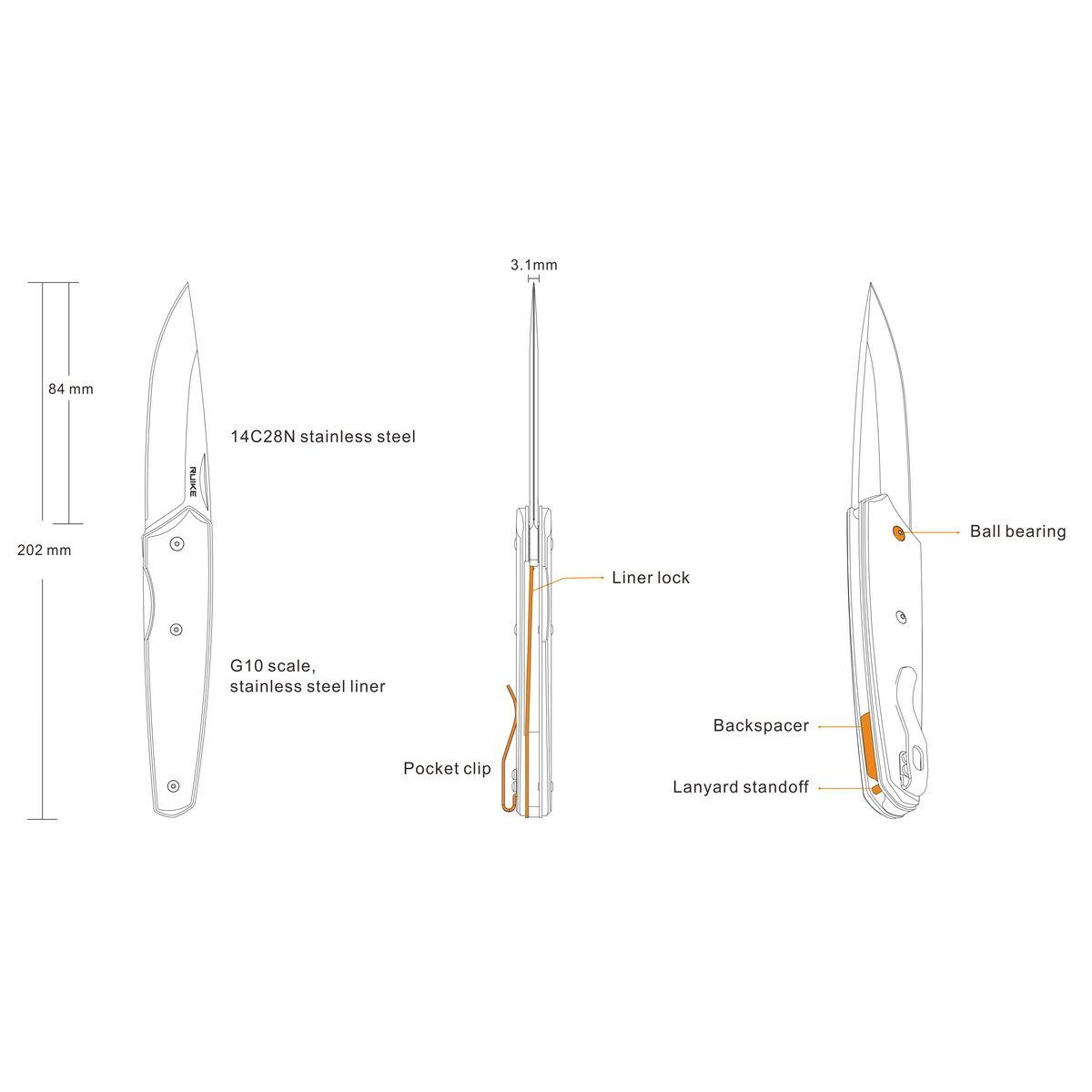 Відкривається ніж за допомогою спеціальної виїмки на клинку. За рахунок наявності підшипників, дістати лезо не складе труднощів навіть тому хто вперше тримає Ruike P848-B в руках. Для його виготовлення використовується високоякісна нержавіюча сталь з маркуванням 14C28N, загартована до рівня 58-60 HRC, що дозволяє лезу залишатися міцним в будь-яких умовах і досить довго зберігати гостроту ріжучої кромки.