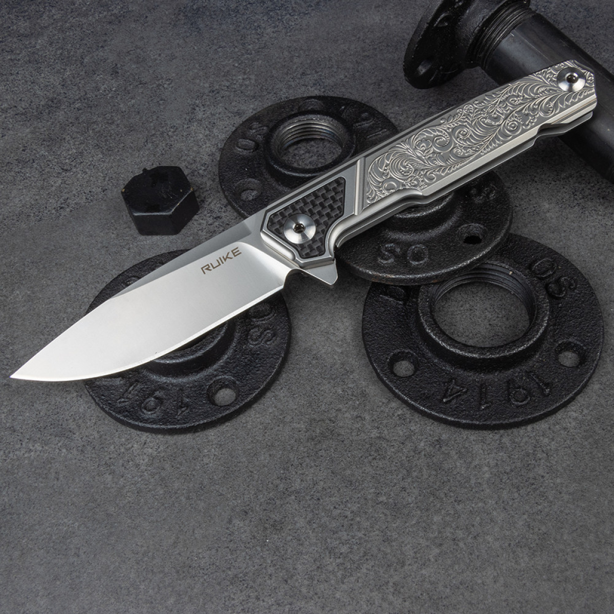 Цей ніж призначений для тих, хто в захваті від варіанту Ruike M875-TZ, але при цьому віддають перевагу лезо із сталі 14C28N і ручку зі сплаву 420. Ефектна складна модель, на рукояті є гравірування у вигляді орнаменту з жимолостю. Жимолость за традицією вважається символом добрих побажань. У ножі є захисний механізм BetaPlus, який запобігає випадкове закриття клинка. Компактна модель стане в нагоді туристам, мандрівникам, і цілком підходить для щоденного носіння. Дуже зручний, легкий, гарний ніж.