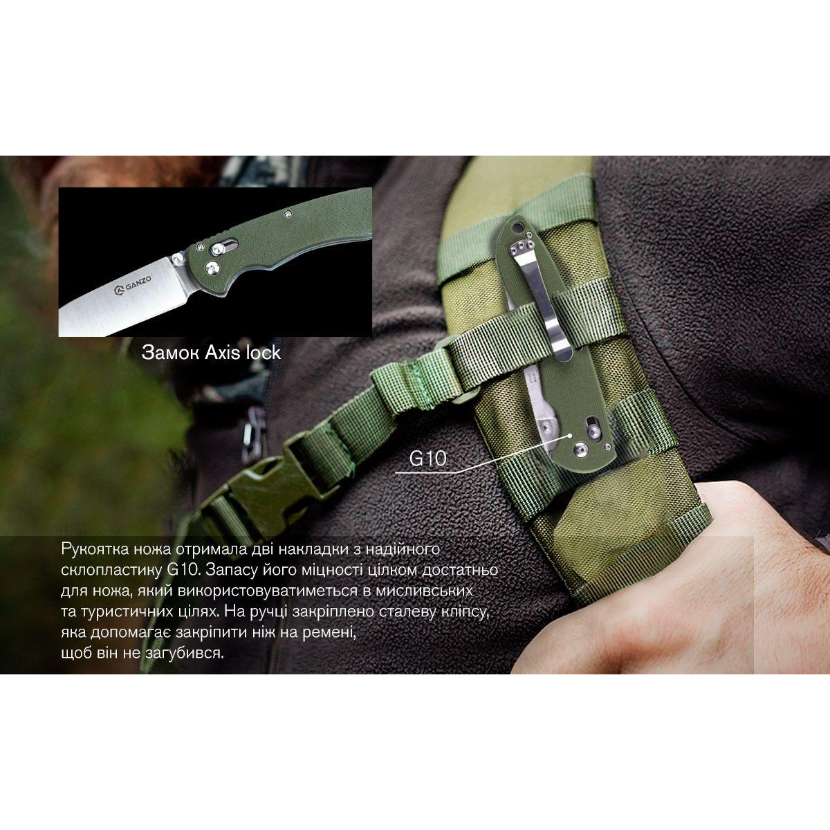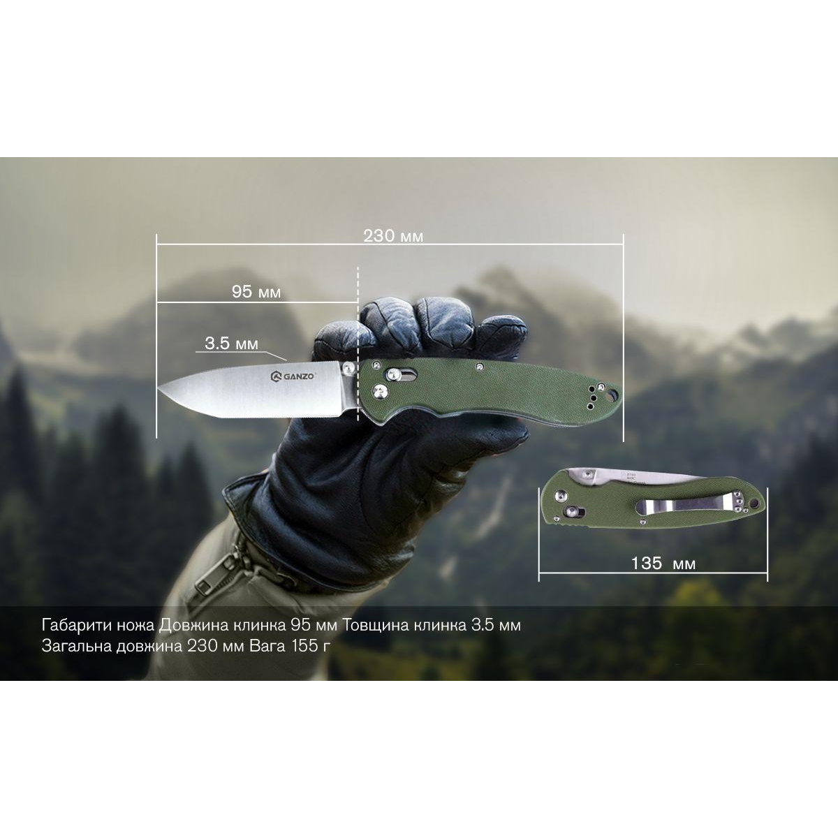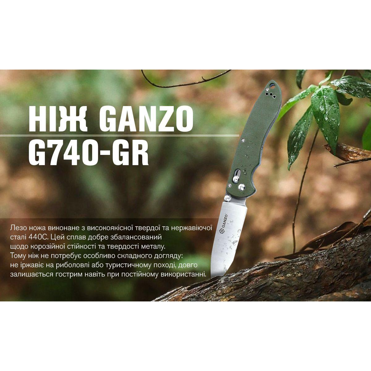 Опис Ganzo G740 : Модель Ganzo G740 — справжній чоловічий ніж. Це стає зрозуміло відразу ж, після того, як ви візьмете його на руки. Адже цей клинок зовсім не маленький і підійде для великої долоні. Довжина леза дорівнює 95 мм. Потужності додає товщина в 3.5 мм по обуху ножа. Завдяки формі леза, ним можна різати, так і колоти. Ріжуча кромка заточена повністю гладко. Необхідно також відзначити, що ножа має сертифікат, що підтверджує, що це не зброя. Ganzo G740 можна використовувати на полюванні, в турпоїздках або ж для різних робіт у місті. Лезо відшліфована методом сатинування: воно гладеньке, блискуче, а на поверхні металу ледь видно сліди абразиву. Повна довжина ножа становить 23 см, але щоб носити Ganzo G740 було зручніше, лезо складається всередину рукоятки. Дістати його можна за допомогою шпенька. А щоб ніж не міг відкритися або скластися без відома користувача, у нього вбудований замок Axsis. Рукоятка ножа має зручну для тривалого утримання в долоні форму. Накладки для неї зроблені з склопластику G10. Цей вид матеріалу міцніше, ніж відомі раніше пластики, але так само довговічний і практичний. До того ж, пластикова рукоятка дозволяє зменшити вагу ножа, зробивши його більш зручним для подорожей. Ganzo G740 важить 155 грам. Особливості: складаний ніж; для леза використана сталь 440С; довжина клинка дорівнює 95 мм; обух товщиною 3.5 мм; рівно заточене лезо; для рукоятки використаний пластик G10; присутній сталева кліпса; вбудований замок Axsis; вага ножа — 155 грам. Гарантія:Дванадцять місяців після покупки, ножі Ganzo G740 використовуються по гарантії.