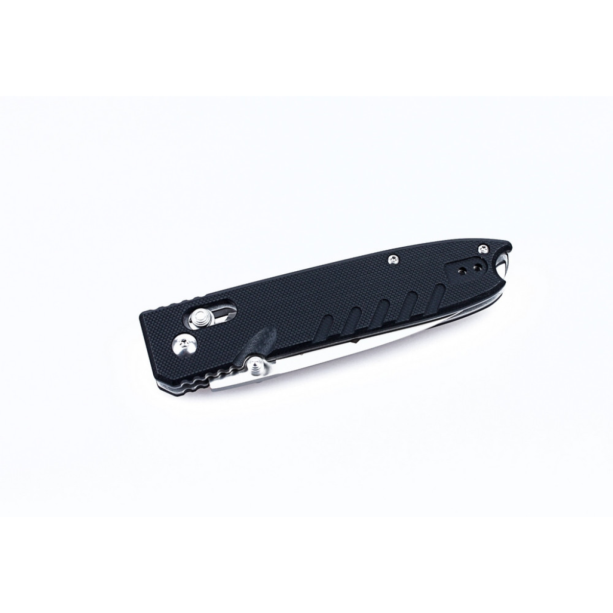 Для рукоятки виготовлені дві накладки з G10. Це сучасний різновид пластику, отримана в результаті з“єднання скловолокна і епоксидних смол. Матеріал дуже міцний і стійкий до більшості негативних факторів. До того ж, склопластик не складно пофарбувати. Тому покупці можуть вибирати між ножами з чорною, зеленої та помаранчевої ручкою. В кожному разі, до рукоятки обов“язково прикручена кліпса, щоб фіксувати ніж у кишені або на ремені.