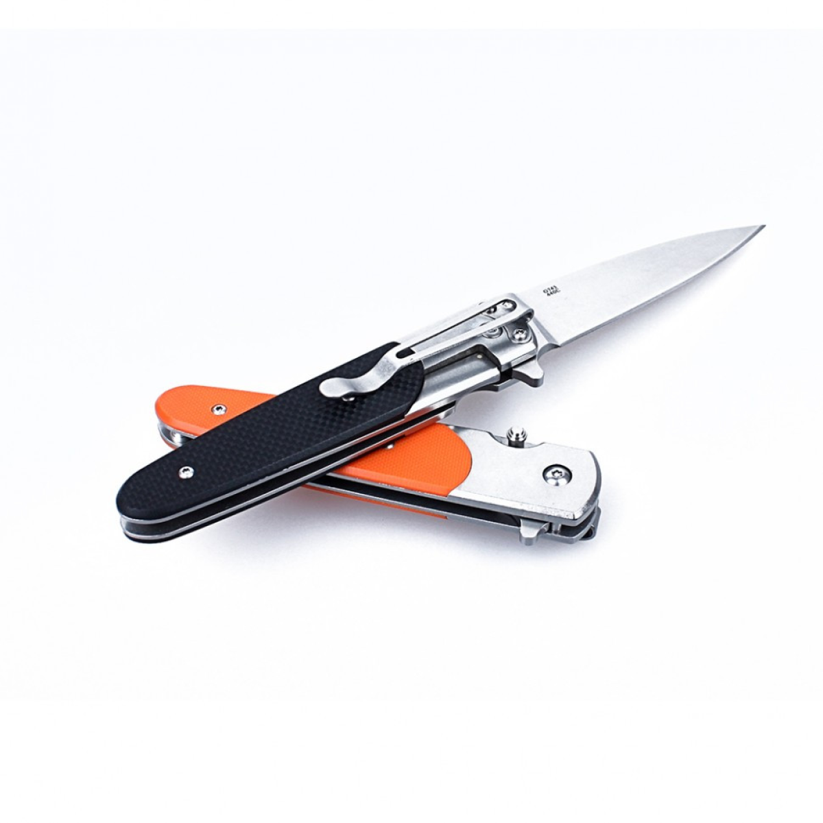 Ніж для туризму Ganzo G743-2 — це практична модель, яка поміститься до будь-якого вашого спорядження. Клинок довжиною 87 мм легко складається всередину рукоятки, завдяки чому переносити ніж стає повністю безпечно. Щоб відкрити його і приступити до роботи, достатньо легко потягнути за шпенек. До речі, у відкритому вигляді лезо легко фіксується і вже не рухається навіть під навантаженням. Цьому сприяє замок Frame Lock — різновид лінійного механізму зі сталевою притискною пружиною, яка одночасно є елементом рукоятки.