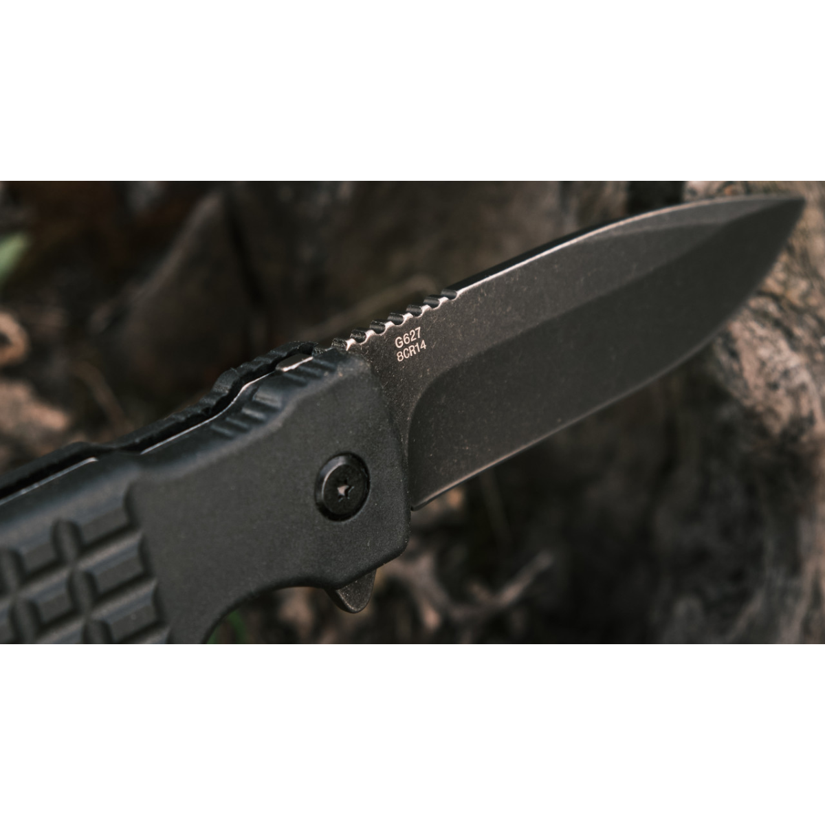 Клинок виготовлений зі сталі 8CR14 з чорним покриттям. Метал демонструє високу опірність до корозії, тому не вимагає спеціального догляду. Твердість марки знаходиться на рівні ±58 HRC, витримуючи баланс між міцністю та легкістю у заточуванні, яке можна виконати в домашніх умовах з використанням звичайних абразивів.