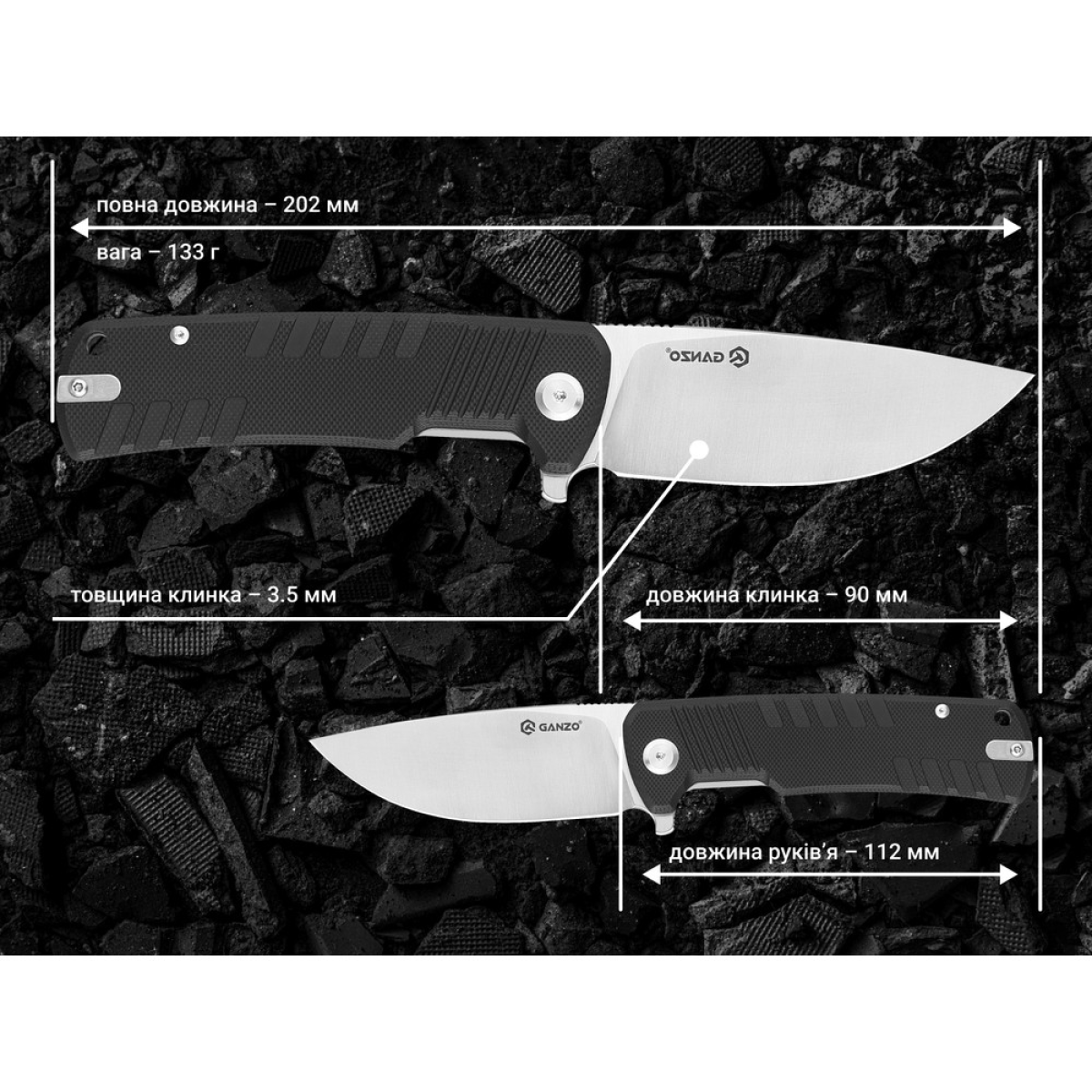 Опис ножа складаного Ganzo G769-BK: Лаконічний дизайн з клинком drop point роблять зі складаного ножа Ganzo G769 справжнього універсала, який з однаковою ефективністю справляється як з повсякденною роботою, так і зі складнішими завданнями, наприклад, заточуванням дерев“яних кілочків або різанням пластикових виробів. Водночас модель не займає багато місця. Вона складається до 112 мм, що в сукупності з вагою, яка не перевищує 135,8 г, полегшує транспортування інструменту в будь-яких умовах: під час носіння в межах міста або на природі, на риболовлі або в кемпінгу. До головних переваг ножа Ganzo G769 належать якісна механіка та використання висококласних матеріалів: Лезо виготовлене зі сталі D2, відомої завдяки зносостійкості, простотою в заточуванні та опірності до корозії. Скільки твердість сягає ±60 HRC, різальна кромка зберігає гостроту впродовж тривалого часу, забезпечуючи точне різання. Накладки з удароміцного склопластику G10 закріплені по обидва боки руківʼя, запобігаючи вислизанню ножа з руки навіть під час носіння рукавичок. Клинок відкривається натисканням на фліпер. Хід леза відрізняється плавністю внаслідок підшипників в осьовому вузлі. Замок liner lock не дає клинку закритися у разі сильного упору на вістря, виступаючи гарантом безпечної експлуатації. Міцність та витривалість роблять ніж відмінним варіантом і для виконання тактичних завдань військовими. Лезо з прямим заточуванням легко перерізає стропи, мотузки тощо, а упор на обуху дозволяє з комфортом покласти великий палець, щоб поліпшити контроль над інструментом. Конструкція доповнена сталевою кліпсою. Її положення можна змінювати на власний розсуд, кріплячи її з правого чи з лівого боку руківʼя. Хвостовий отвір призначений для темляка. Характеристики: складаний ніж на кожен день, для військових, туристів, рибалок; колір – чорний; профіль клинка – drop point; матеріал клинка – сталь D2 (твердість ±60 HRC); тип заточування – прямий; миттєве відкривання однією рукою натисканням на плавець фліпера; замок liner lock; матеріал накладок на руківʼї – склопластик G10; повна довжина ножа – 202 мм; довжина клинка – 90 мм; товщина в обуху – 3,5 мм; довжина руківʼя – 112 мм; товщина руківʼя – 13 мм; вага – 135,8 г.
