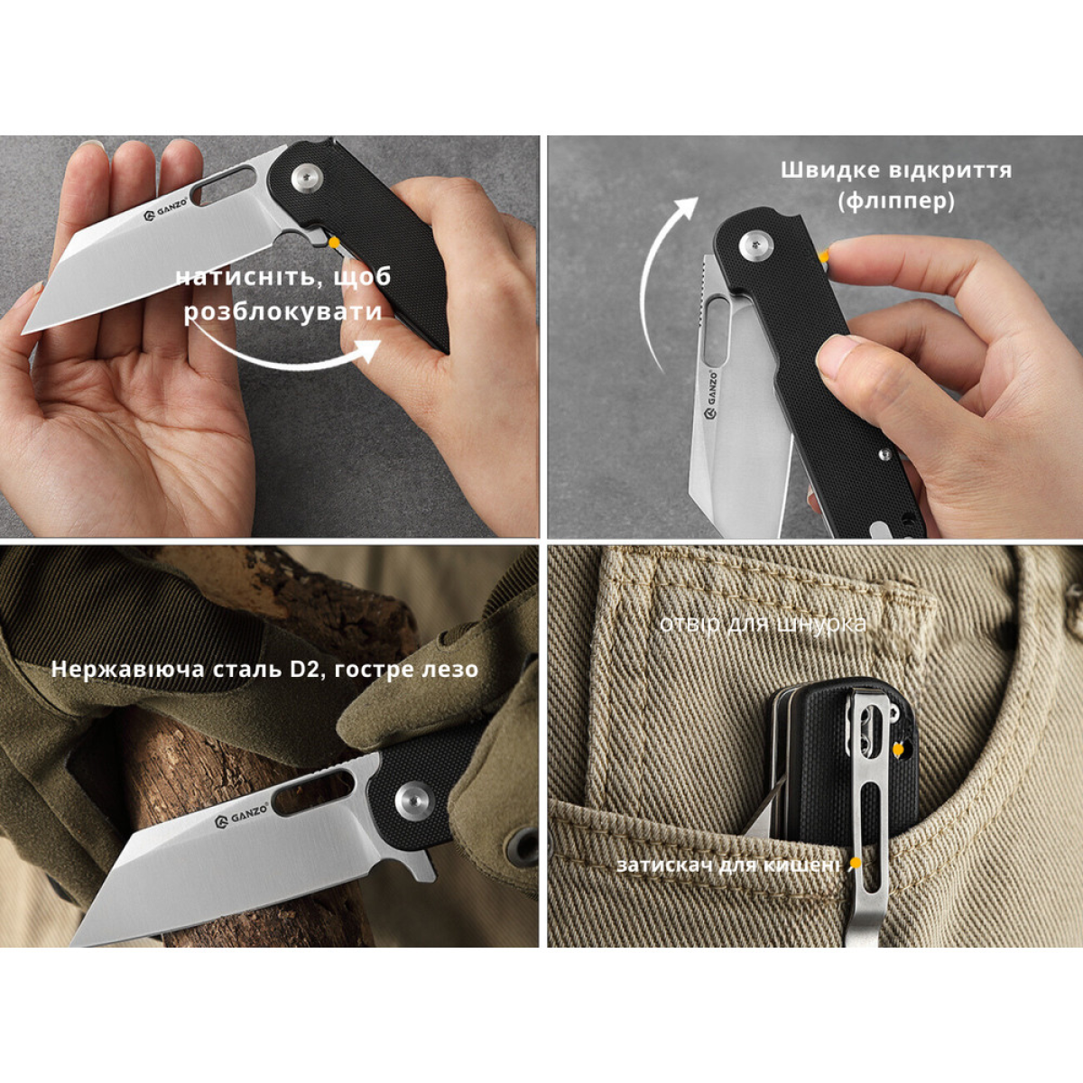 Опис ножа складаного Ganzo G770-BK: Ніж Ganzo G770 — компактний універсал в асортименті складаних інструментів Ganzo. Різати, пиляти, проколювати та надрізати — модель справляється з будь-яким завданням з однаковою ефективністю завдяки клинку з профілем wharncliffe, що має подовжену різальну кромку та загострений кінчик для тонких робіт. Конструкція виготовлена зі зносостійких матеріалів, які довели свою практичність протягом багатьох років використання у ножовій промисловості: Сталь D2 у клинку. Марка може похвалитися високою твердістю (±60 HRC) та непоганим опором корозії, що є актуальним у разі експлуатації у вологому середовищі. До того ж сталь зберігає гостроту різальної кромки впродовж тривалого часу, тому ви можете сміливо використовувати ніж для роботи з матеріалами різної щільності — від харчових продуктів до твердих виробів, наприклад, з дерева чи пластику. Плашки G10 на руківʼї. Композитний матеріал на основі склотканини відрізняється зносостійкістю та несприйнятливістю до хімічних впливів. Текстурована поверхня накладок забезпечує надійний хват за будь-яких умов та під час роботи в рукавичках. Відкривати ніж можна кількома способами, і в будь-якому з них відкривання відбувається миттєво, дозволяючи привести інструмент у робоче положення за долі секунди. Для цього можна натиснути на плавець фліпера або підчепити клинок за овальний отвір, що знаходиться ближче до обуха. Безпека ножа — критично важливий аспект у будь-якому складаному інструменті, і тут вам теж немає за що хвилюватись. Фіксацію клинка забезпечує механізм Liner Lock. Це один із найпопулярніших замків у складаних ножах, який поєднує простоту та високу надійність. Приємний бонус — Liner Lock не тільки гарантує безпеку під час роботи з ножем, але також дозволяє швидко ховати клинок у руківʼя одним рухом руки. Модель розрахована на EDC носіння, складається до розмірів 116 мм (довжина) та комплектується сталевим затискачем на кишеню, щоб ви завжди могли тримати інструмент під рукою на випадок необхідності. Характеристики: універсальний складаний ніж для щоденного носіння (EDC); колір – чорний; матеріал клинка – інструментальна сталь D2 (твердість ±60 HRC); профіль клинка – wharncliffe; тип заточування – прямий; 2 способи відкривання конструкції (плавець фліпера, отвір у клинку); запірний механізм – замок Liner Lock; матеріал накладок на руківʼї – G10; повна довжина – 204 мм; довжина клинка – 88 мм; товщина клинка – 3,5 мм; довжина руківʼя – 116 мм; товщина руківʼя – 13 мм; вага – 130 г; є сталевий затискач на кишеню.