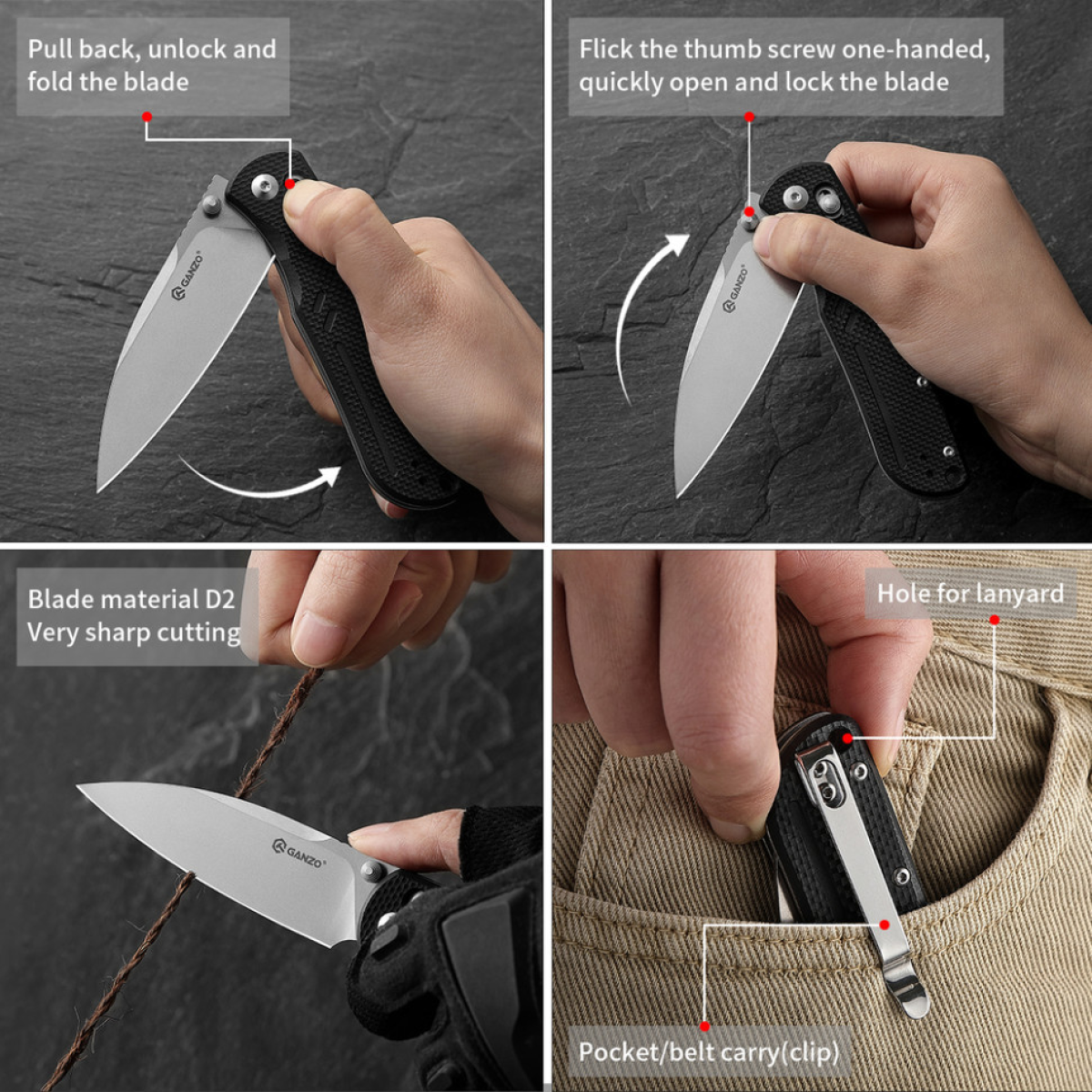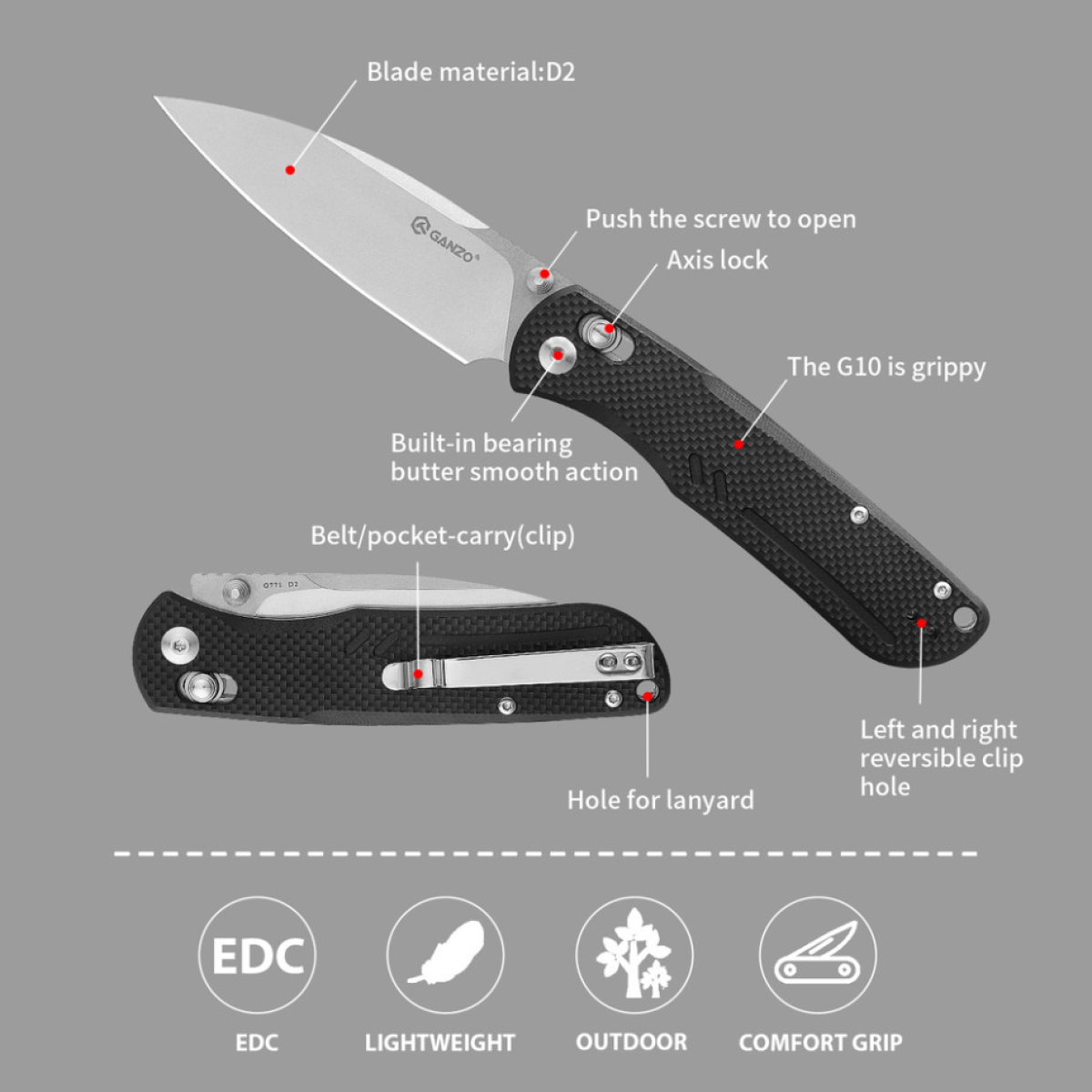 У ножі Ganzo G771 поєднуються універсальність EDC-моделі та стриманий стиль, характерний для інструментів бренду. Завдяки класичному клинку Drop Point ніж покриває всі базові потреби з різання — від побутових завдань, як розкриття паковань, до підготовки гілок для розпалювання багаття на природі.