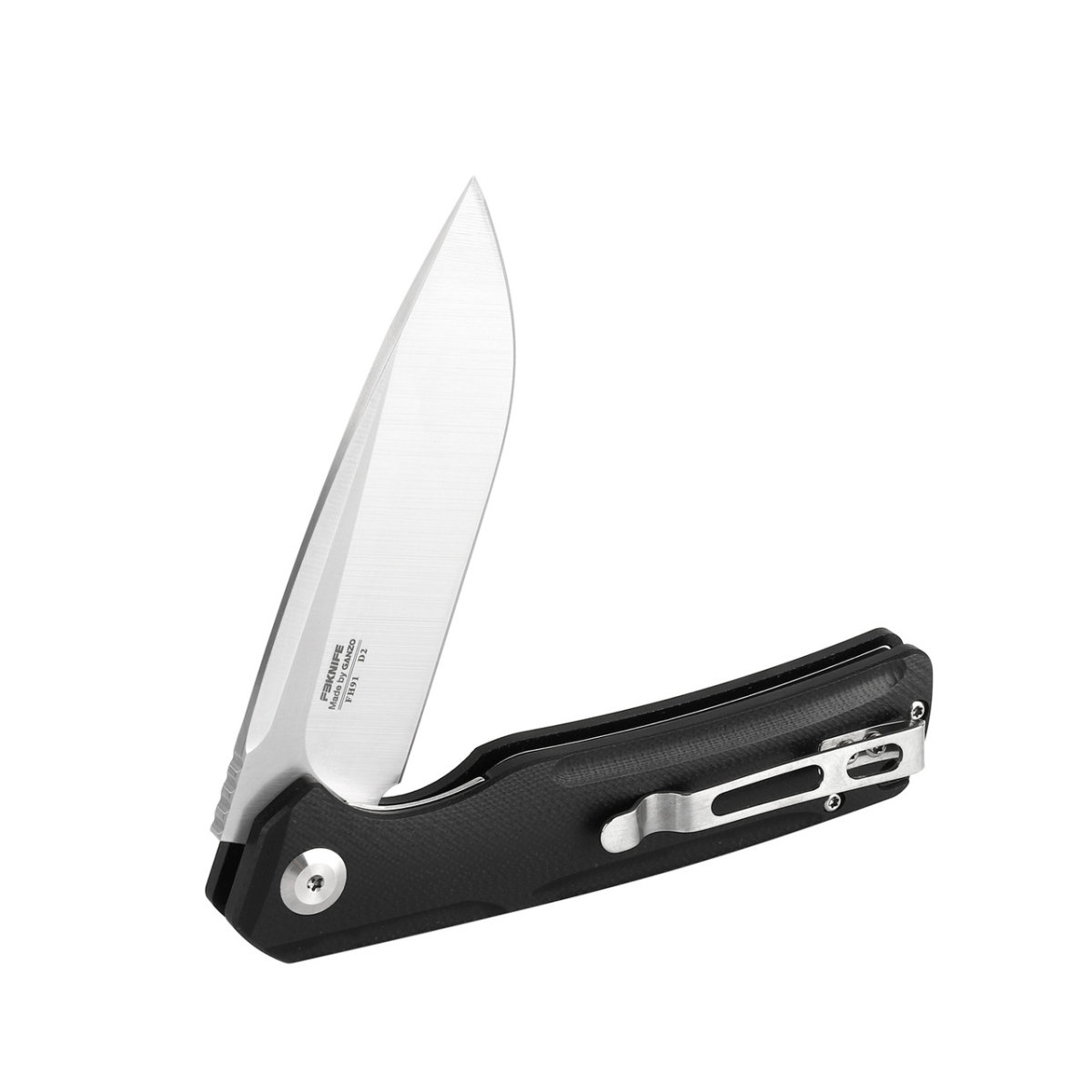Ніж-фліппер FH91 виконаний з надійною сталі марки D2, і має відмінну твердість близько 60 одиниць Роквелла. Тип заточення – прямий. Це ніж кишенькового формату, з формою леза drop-point. Клинки різновиди drop-point дуже популярні, їх часто можна зустріти на моделях ножів. Відмітні особливості: лезо нагадує по виду normal blade, однак вістря опущено ближче до центру леза. Лезо демонструє хороші ріжучі та колючі здібності. Універсальність профілю дозволяє застосовувати вироби з клинками такого типу в якості мисливських і туристичних, господарсько-побутових, тактичних, EDC та інших. Ніж захищений від іржі, розрахований на тривалу експлуатацію.
