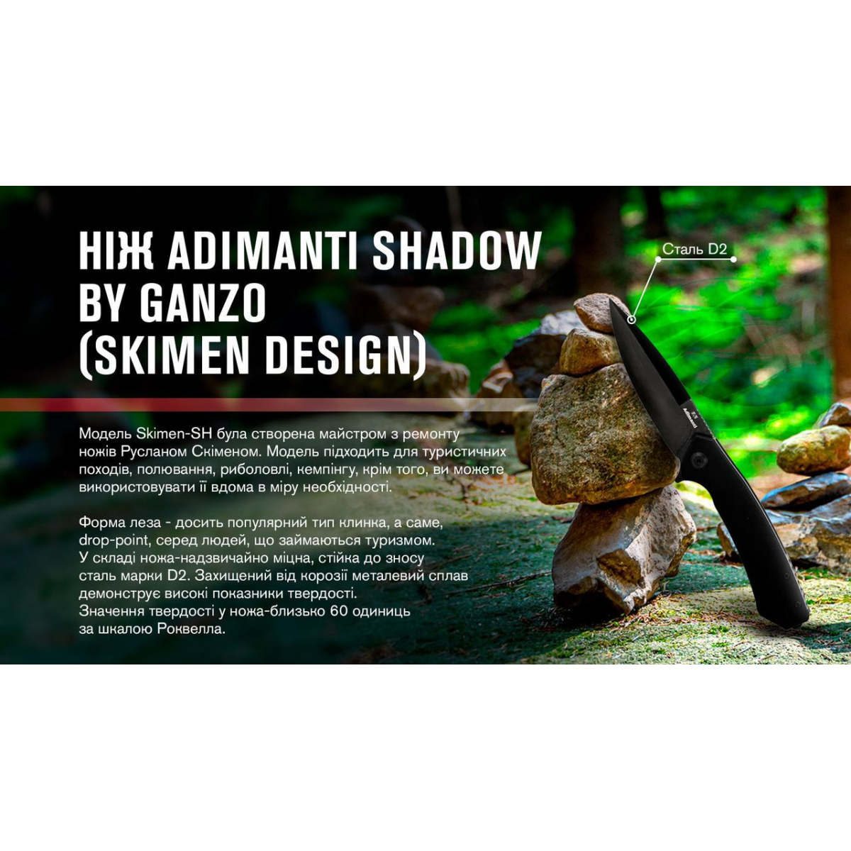 Модель Skimen-SH була створена майстром з ремонту ножів Русланом Скіменом. Це дебютний ніж з дизайнерської серії Adimanti, і він втілив в собі зручність, логіку, респектабельність. Бренд Ganzo вже давно і міцно закріпився на ринку з репутацією виробника недорогих і якісних ножів. Ця модель продовжує сформовану тенденцію, і відповідає загальним принципам продукції торгової марки.