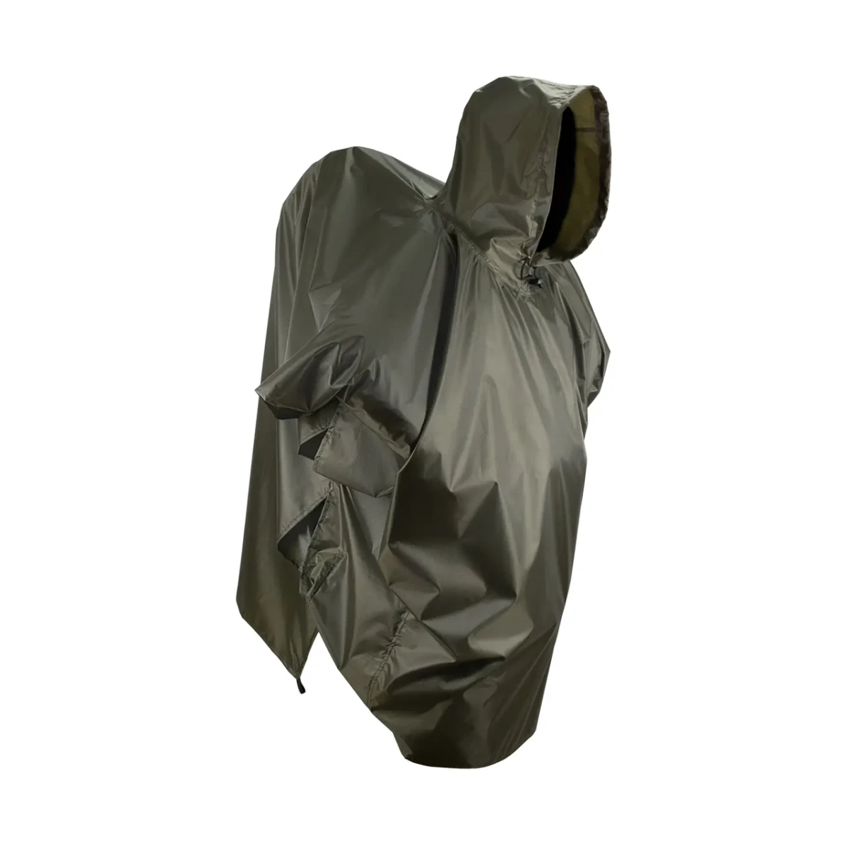 Пончо виготовлене з міцної та водостійкої тканини Polyester Ripstop PU, що має водостійкість 4000 мм. Поліуританове просочення надає тканині додаткову захист від вологи, а її легкість забезпечує комфорт під час носіння. Крім того, його можна використовувати як тент для укриття від опадів або сонячного проміння. Для зручності підвішування виробу передбачено петлі на кутках.