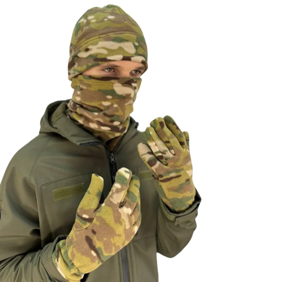 Комплект (шапка, бафф, перчатки) - це ідеальне поєднання, будь готовий до будь-яких погодних умов. Захистіть своє обличчя та руки від морозного та холодного повітря, будь те завжди в затишку та теплі. Комплект виглядає дуже стильно все одному кольорі. Чудовий подарунок як для когось так і для себе. Тепла шапка та бафф з флісу щільністю 250 грм2, перчатки з флісу щільністю 280 грм2. Виготовляється з м“якого та теплого матеріалу. Дуже приємний на дотик та непродуваємий вітром. Бафф оснащено фіксатором затяжка-гумка, для затягування та більш щільнішого прилягання тканини до тіла. Останнім часом у морозні часи чудово себе зарекомендували вироби із флісу. Завдяки більщій щільності матеріалу витримує нищі температури і відповідно краще захищає від уражень холодом, морозостійкий. Цей матеріал фактично не втрачає своїх властивостей під час носіння, не дратує шкіру, не розтягується, легко стирається та швидко сохне. Саме тому його обирають як виробники так і споживачі. Шапка міцно сидить на голові. Можна використовувати під шолом. Має стильний дизайн та анатомічний крій. Матеріал: фліс 250-280 грм2; Колір: мультикам; Розмір шапки: 58-61 см; Розмір перчатки: універсальний; Розмір бафф: XL - 29х27 см.