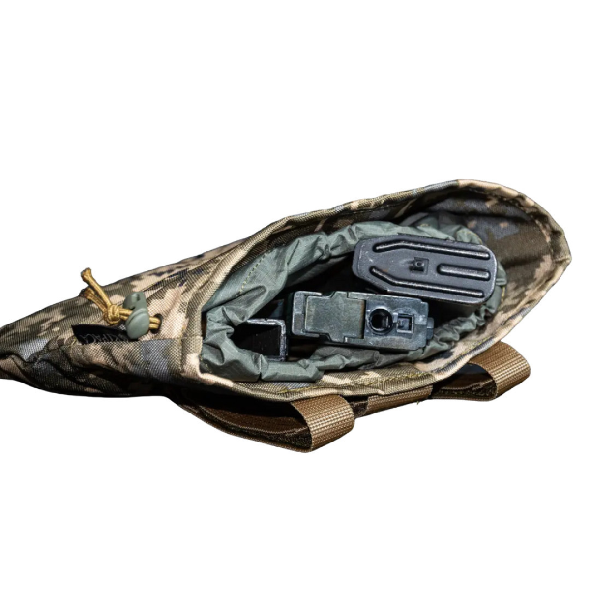 Що може бути важливішим за життя? На вогневій позиції це дуже відчутно. А що може зберегти життя воїну? Навички, вміння та час! Так, саме час. Кожна секунда має бути використана максимально раціонально. Саме для цього військовим необхідна ця сумка, вона призначена для скидання магазинів “наосліп“ при екстреній перезарядці зброї. Максимальна концентрація на противнику, без роздумів про те, куди подіти використані ріжки, адже вони стануть у нагоді в бою. Для фіксації підсумку використовується система кріплення MOLLE за стандартами НАТО. Легкий міцний й надійний, виготовлена з тканини, що не пропускає воду, не боїться пилу та бруду, не деформується. Сумка не лише для скидання використаних магазинів, а й для зберігання будь-яких невеликих речей (телефона, навушників тощо). Кріпиться до поясу, бронежилета та рюкзака за допомогою стрічки-липучки або на стропах з пряжками, виготовлений із щільного матеріалу Cordura 1000. Присутня альтернативна система кріпленя на пояс за допомогою кнопок. Легкий, але міцний водонепроникний клапан на гумці з фіксатором. Має робоче положення, і положення скручування По внутрішньому периметру горловини має стягувальну резинку-стопер, завдяки чому магазини та інше спорядження не випадають. Має два люверси на дні для стоку води. Характеристика: Розмір: 27х29 см; Тканина: Cordura 1000; Колір: піксель; Вага: 200 г.