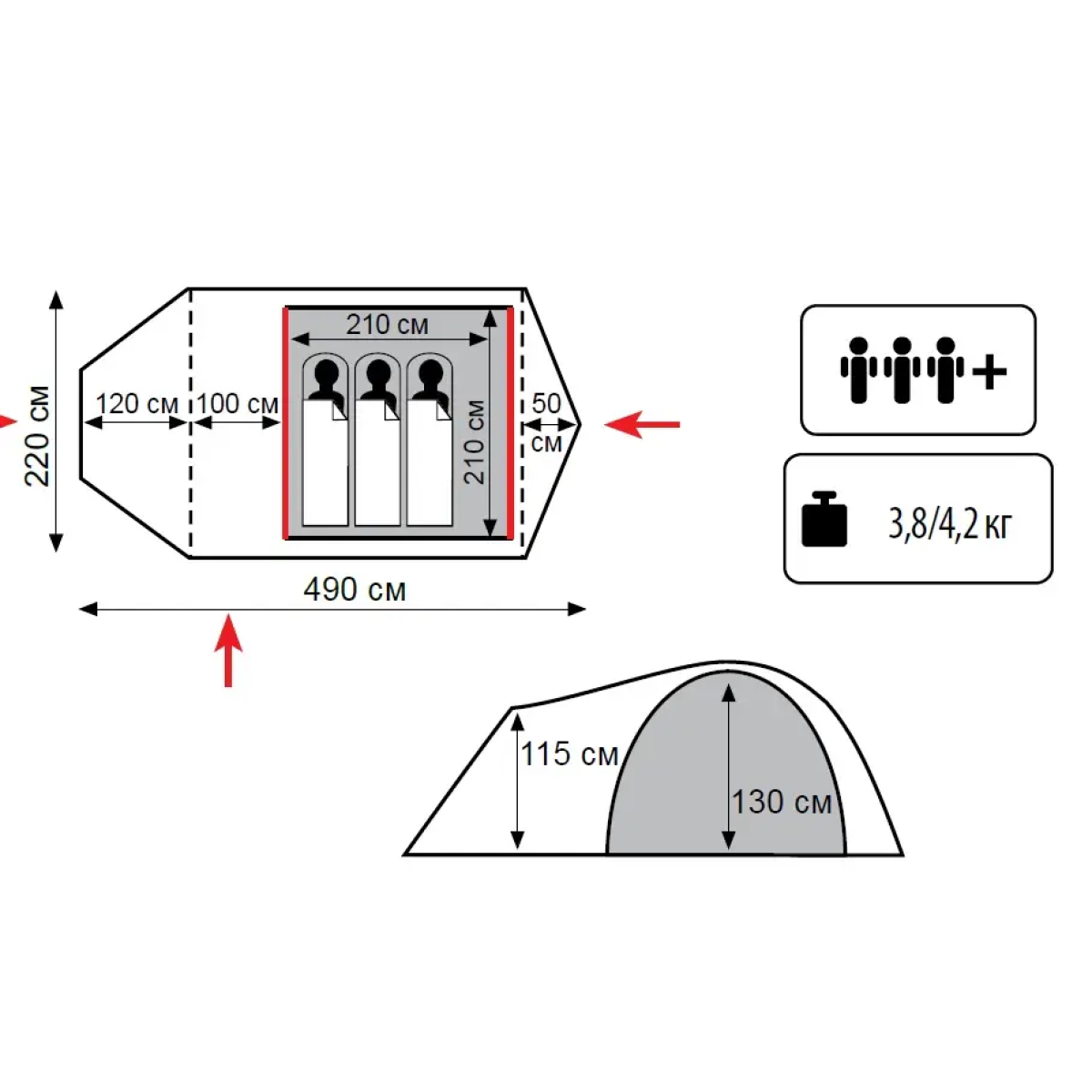 Намет TrampLite Twister 3+1 – Простір та комфорт для туризму TrampLite Twister 3+1 – це тримісний туристичний намет з трьома входами, який забезпечить зручність і комфорт під час аматорських походів, риболовлі та відпочинку на природі. Просторий тамбур і відмінна вентиляція роблять цей намет ідеальним для використання в теплу пору року. Особливості конструкції: Трьома входами: два входи через просторі тамбури та один через задню торцеву стіну для зручності. Двошарова конструкція для покращеної вентиляції та захисту від погодних умов. Вхід спального відсіку продубльований москітною сіткою для захисту від комах. Великий тамбур для зберігання спорядження або організації кухні. Два вентиляційних клапана для покращеного повітрообміну. Проклеєні шви для водонепроникності. Ідеально для: Аматорського туризму, риболовлі та відпочинку на природі. Використання в весняний, літній та осінній період. Характеристики: Вага: 4,2 кг Матеріал тента: 100% поліестер 75D/190T WR PU 4000 мм в. ст. Матеріал внутрішнього намету: 100% дихаючий поліестер Матеріал дна: Армований терпаулінг 10000 мм в. ст. Каркас: Фіберглас 8,5 мм Розміри: 490 х 220 х 130 см Розмір в упаковці: 18 x 57 x 17 см Колір тенту: Пісчаний TrampLite Twister 3+1 – це намет для тих, хто цінує простір та комфорт під час коротких літніх походів та активного відпочинку на природі.