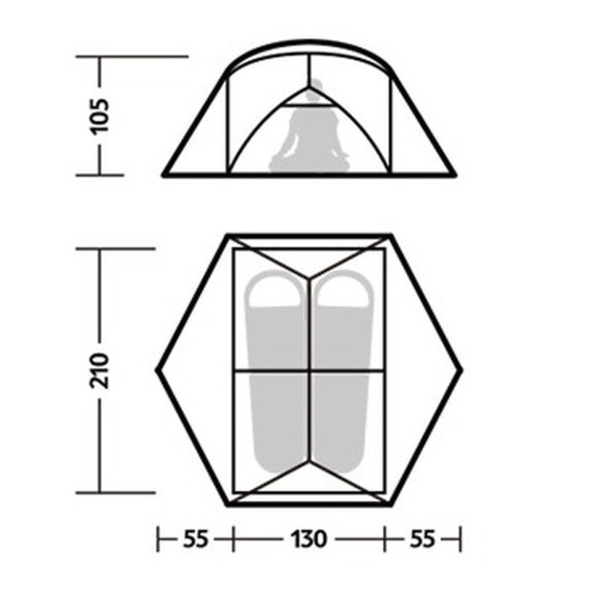 Зовнішній тент з нейлону 15D із силіконовим шаром. Матеріал відрізняється легкістю та стійкістю до механічних пошкоджень. Силікон надає додаткову водостійкість (1500 мм вод. ст.), протистоїть намоканню під час короткочасних опадів, роси та туману.