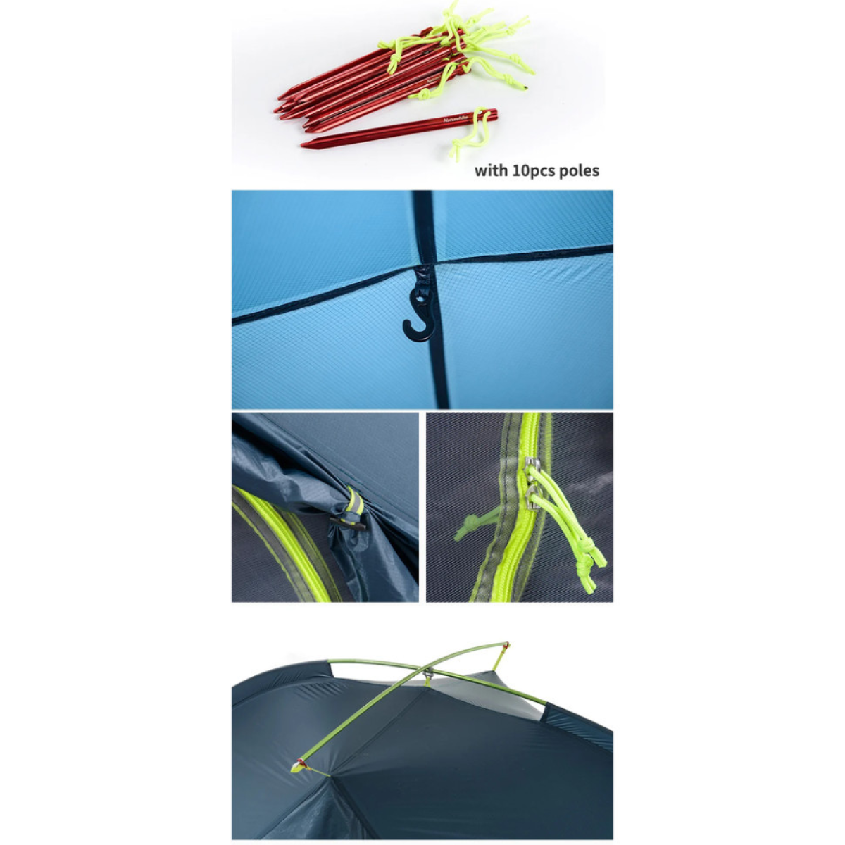 Опис двомісного намету Naturehike Tagar NH17T180-J, темного блакитного: Намет Naturehike Tagar належить до надлегкого спорядження для активного відпочинку. Ви можете брати його у туристичну подорож, трекінг, тривалі походи у весняно-осінній період — завдяки вазі лише 1,2 кг (без урахування кілочків) модель мінімально впливає на вагу всього спорядження, пропонуючи надійне укриття від негоди для 1-2 користувачів. Naturehike Tagar має двошарову конструкцію зі стійких до зношування матеріалів, які не бояться високих навантажень та захищають від негоди: Зовнішній тент, внутрішній намет і підлога з нейлону 20D. Матеріал зберігає форму під час навантажень, не розтягується та протистоїть появі зачіпок. Силіконове покриття наділяє тканину водовідштовхувальними властивостями. Водостійкість сягає 4000 мм, тому ви сміливо можете використовувати намет під час інтенсивних опадів: він не промокне та збереже внутрішній простір сухим. Каркас з алюмінієвого сплаву 7001. Алюміній демонструє високу гнучкість і механічну міцність, гарантуючи каркасу стійкість у вітряну погоду. Метал також має відмінні антикорозійні властивості, не покриваючись іржею навіть у разі тривалого впливу вологи. Розміри Naturehike Tagar у встановленому положенні сягають 210 х 125 х 105 см. Внутрішній намет доповнений дихаючою сіткою. У стелі передбачено вентиляційне віконце для прискорення циркуляції повітря всередині, а збоку є невелика кишеня для зберігання дрібного приладдя. Модель згортається у рулон, займаючи мінімум місця — не більше 44 х 10 см у складеному вигляді. Фірмовий чохол на стяжках призначений для зберігання намету та захищає його від забруднення під час транспортування. Характеристики: двошаровий намет для трекінгу, альпінізму, піших походів у міжсезоння (весна / осінь); колір – темний блакитний; місткість – двомісний; основний матеріал – нейлон 20D із силіконовим покриттям; внутрішній намет доповнений дихаючою сіткою B3; водостійкість – 4000 мм; матеріал каркаса – алюмінієвий сплав 7001; розміри у встановленому положенні – 210 х 125 х 105 см; розміри у складеному вигляді – Ø10 х 44 см; вага – 1,2 кг (без кілочків); офіційна гарантія – 1 рік.