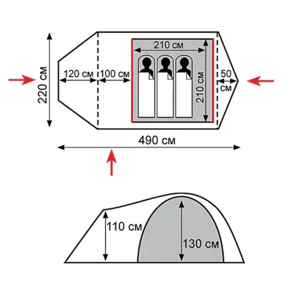 Три входи: два з тамбура та один зі зворотної сторони намету, що забезпечує зручний доступ до намету з різних напрямків.