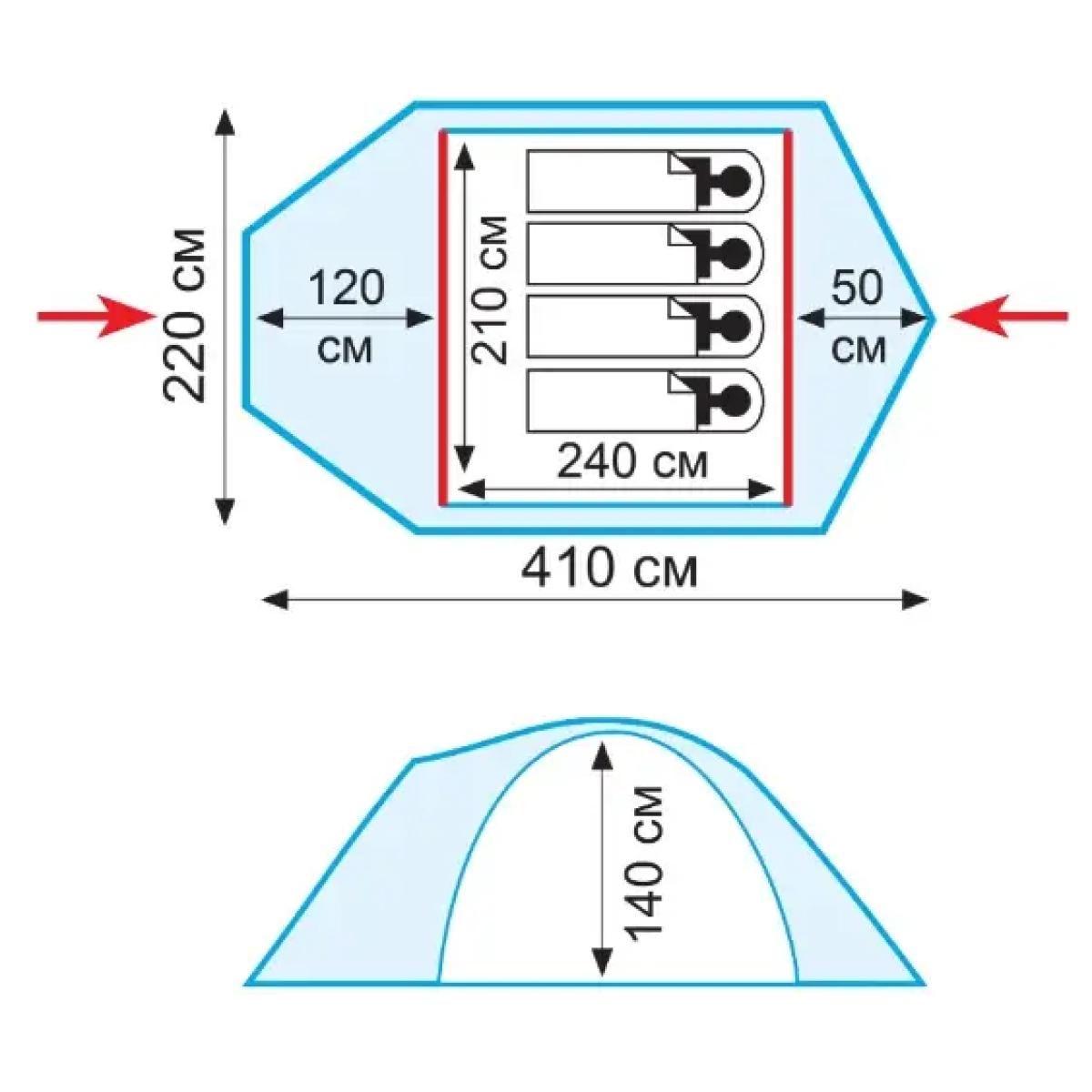 - 2 входи і 1 тамбур, входи внутрішнього намету продубльовані москітною сіткою