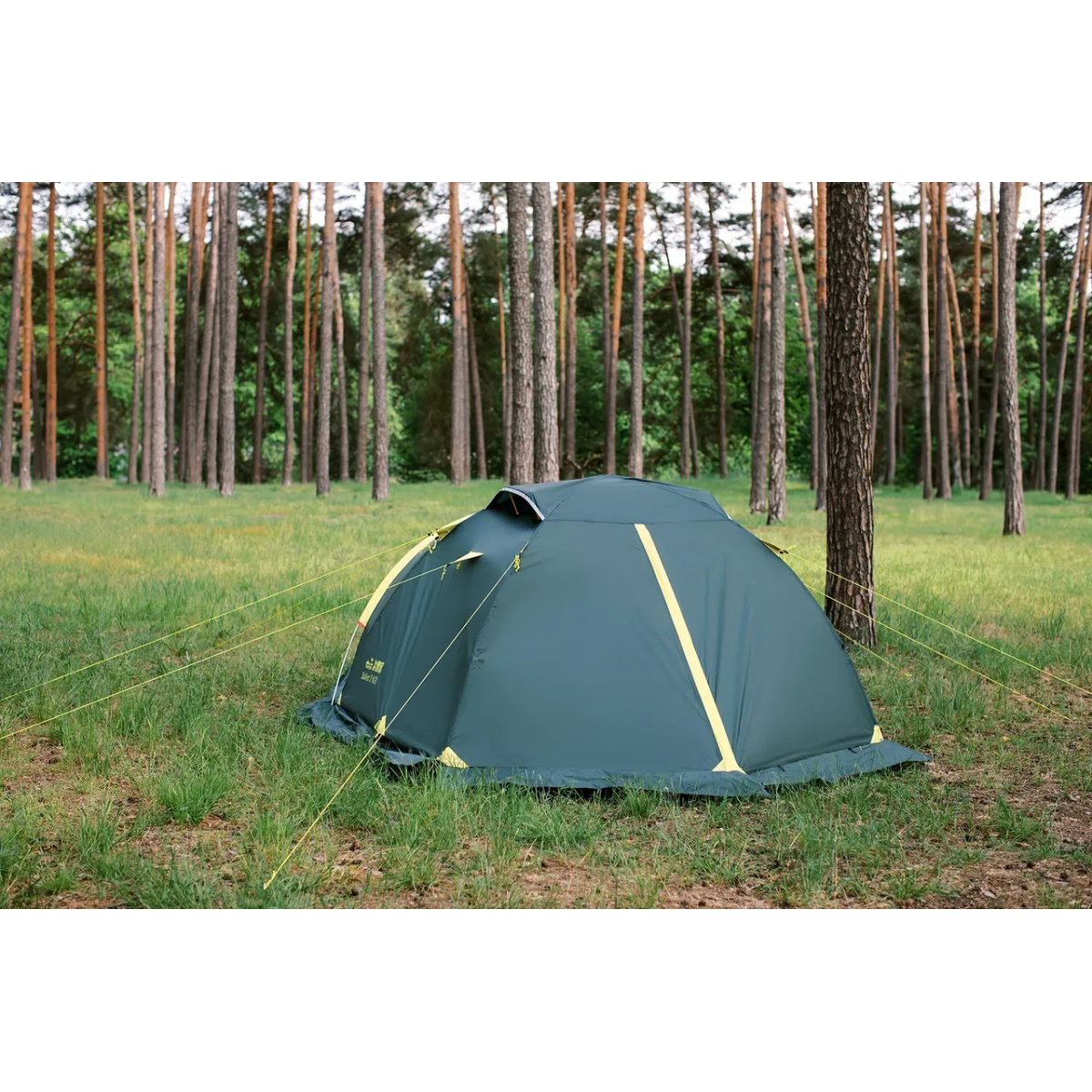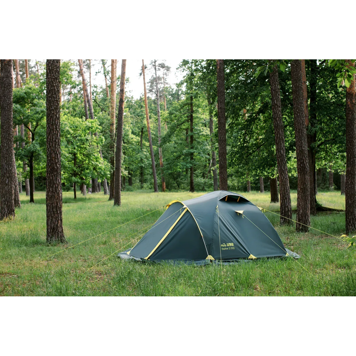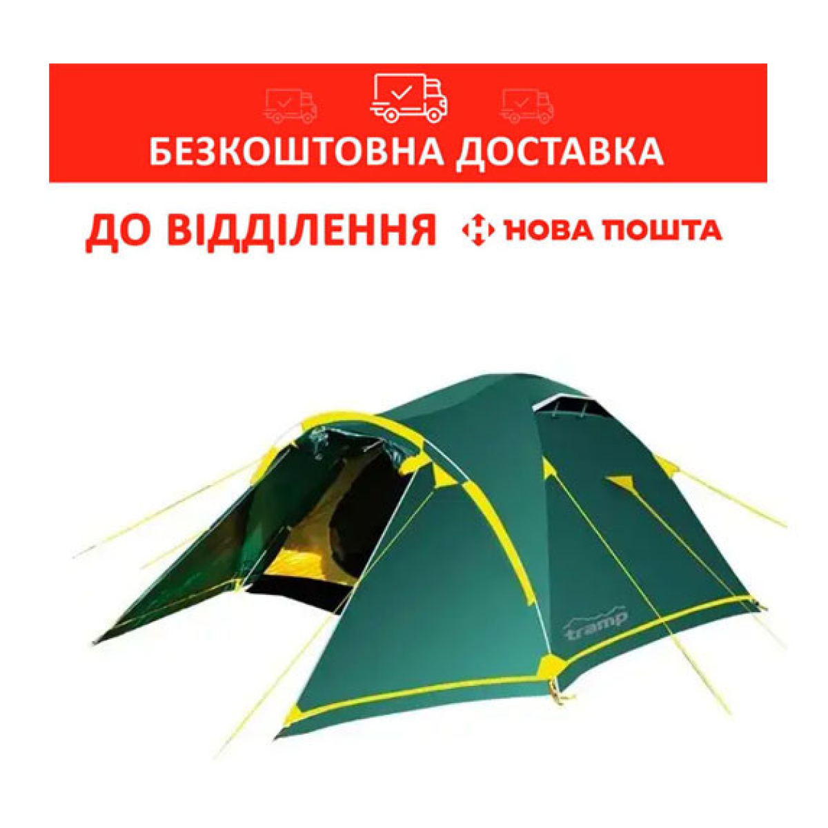 Універсальний намет Tramp Stalker 4 (V2). Тридугова модель конструкції “напівсфера“ з просторим тамбуром, двома входами та снігозахистом по периметру зовнішнього тента.