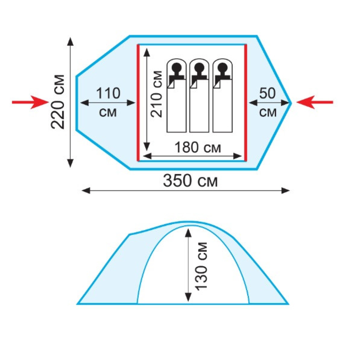 Універсальний намет Tramp SPACE 3 (V2) Універсальна тримісна туристичсекая намет Tramp SPACE 3 (V2) з зовнішнім розташуванням каркаса і просторим тамбуром. Три зовнішні дуги забезпечують високу стійкість намету до вітру і дощу. Перевага використання в конструкції намету зовнішніх дуг: зручність установки під час дощу (спочатку ставиться тент, а потім під прикриттям внутрішній намет пристібається, яка залишається сухою). Можливість значно швидше складати і ставити суху намет — досить дістати (або ввести) дуги в кишені на тенті. Конструкція намету більш вітростійка, ніж класичний намет з дугами “всередині“, за рахунок більш сильного натягування тенту і жорсткої фіксації дуг. Зовнішні дуги сильніше натягують зовнішній тент, за рахунок чого конденсат швидше скочується з його внутрішньої поверхні, не затікає в спальний відсік. Завдяки вешнему розташуванню дуг простір між шарами намети стає більше за рахунок чого поліпшується вентиляція і знижується кількість конденсату. Призначення: піший та гірський туризм. Час використання: весна літо осінь. Особливості: - Зовнішній каркас - Двошаровий намет з двома входами - Дуги розташовані в зовнішньому тенті, швидка установка - Можна встановлювати без внутрішнього намету - Зовнішній тент намету стійкий до ультрафіолетового випромінювання - Зовнішній тент має просочення, що затримує поширення вогню - Великий місткий тамбур - Два вентиляційних клапана - Збільшені внутрішні кишені - Світловідбиваючі відтяжки та елементи вентиляції - Всі шви проклеєні - Ідеальна для туристичних походів у весняний, літній і осінній час Характеристики: Тип: Універсальна намет Кількість місць: 3 Вага намету: 5,2 кг Розміри: 220 х 350 х 130 см Кількість входів: 2 Тент: 100% поліестер 75D/190T RipStop 6000 мм ст. ст. Внутрішня намет: 100% дихаючий поліестер Дно: 100% поліестер 75D/190T 8000 мм ст. ст. Каркас: Durapol 8,5 мм Розмір в упаковці: 16 x 57 x 17 див.