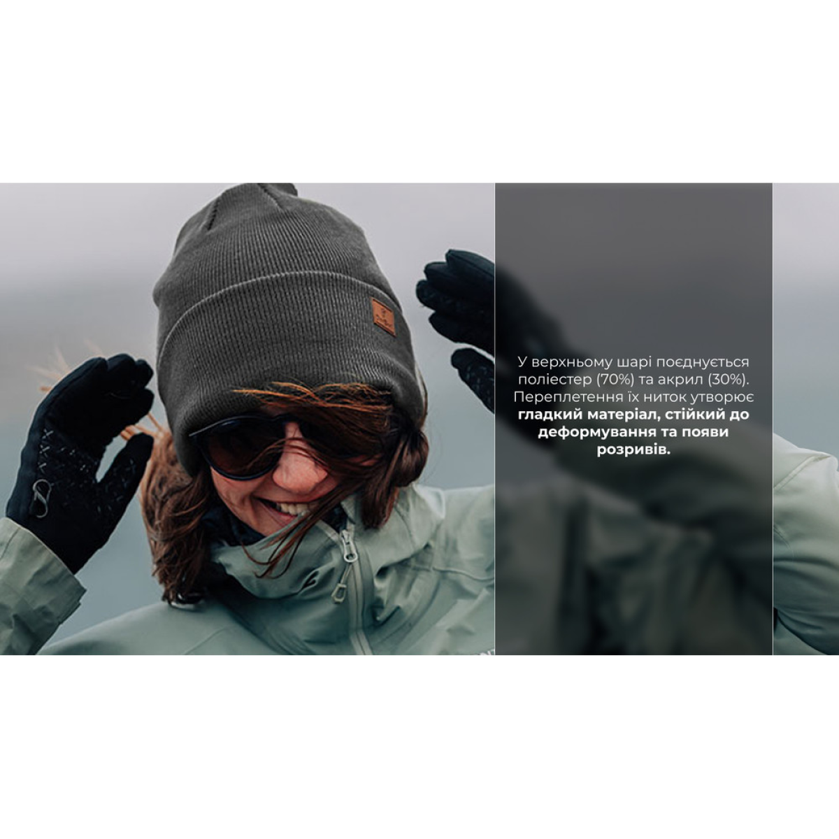 У верхньому шарі поєднується поліестер (70%) та акрил (30%). Переплетення їх ниток утворює гладкий матеріал, стійкий до деформування та появи розривів. Незалежно від того, як сильно користувач розтягуватиме шапку при надяганні та знятті з голови, вона прийматиме початкову форму завдяки еластичному верхньому шару.