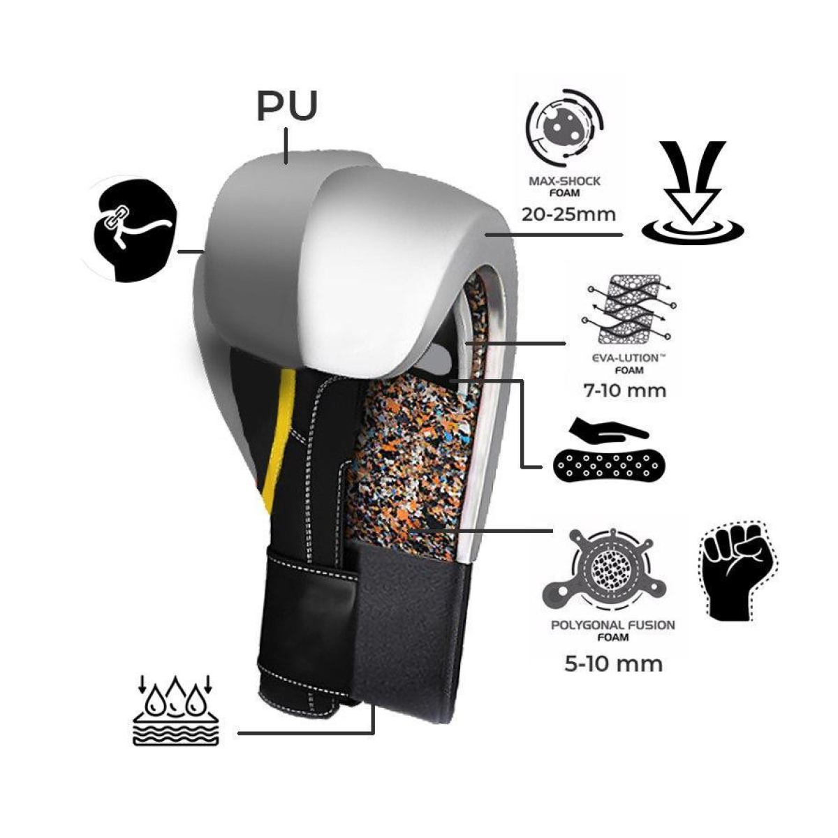 Призначення: Боксерські рукавиці для тренувань у повному спорядженні, спарингів, і у режимі «бій з тінню». Рукавиці призначені для інтенсивних тренувань спортсменів різної кваліфікації. Опис: Боксерські рукавиці PowerPlay 3074 можуть використовуватись як для тренувань, спарингів, змагань так і для роботи з боксерськими мішками і грушами. Ця модель рукавиць виготовлена із високоякісного замінника шкіри на основі поліуретану (PU), яка має структуру ідентичну натуральній шкірі. Поліуретанова шкіра рахується еко-шкірою – вона не викликає алергії у людей. Серед переваг такого матеріалу – стійкість до механічних пошкоджень (не рветься і не дряпається), еластичність, тривалий термін експлуатації. Застосування синтетичних технологій дозволило створити бюджетну серію боксерських рукавиць, які підходять як початківцям, так і досвідченим бійцям для тривалого використання. Внутрішня підкладка виготовлена з тканини з абсорбуючим ефектом, яка ефективно поглинає воду і тому, руки навіть при великій кількості тренувань залишаються сухими. Перфорація на долоні гарантує відмінну вентиляцію. Зручна і правильно-анатомічна форма рукавиці сприяє правильному положенню руки і великого пальця. Великий палець прикріплений. Широка застібка забезпечує зручну посадку руки, а також надійний захист та підтримку зап“ястя. Рукавиці зручно одягаються, надійно фіксуються застібкою на липучці. Спеціальний тришаровий пінний наповнювач створює амортизацію і відмінно поглинає удар. Верхня ударна зона – 20-25 мм латексна піна. Середня ударна зона – 7-10 мм меморі піна. Внутрішній шар (біля руки) – 5-10 мм PE піна. Завдяки цій технології піна найкращим чином поглинає і розсіює ударну силу соперника і дає можливість наносити сильні удари у відповідь. Для захисту від сильних ударів суперника передбачене додаткове ущільнення на долоні. Окрім високих функціональних властивостей, рукавиці цієї моделі також відзначаються стильним дизайном. Тепер проаналізуємо на скільки унцій вибрати рукавиці. Якщо є така можливість, то найкращим варіантом буде уточнити безпосередньо у свого тренера, рукавиці якої ваги підійдуть саме Вам. Якщо такої можливості немає, скористайтеся такими правилами: Дітям віком 4-10 років підійдуть рукавиці 6 унц. (Варто звернути увагу на те, що деякі тренери займаються навіть з маленькими дітьми у рукавицях 10 унц., щоби діти відразу звикали до важких рукавиць). Спортсменам вагою 50-65 кг цілком підійдуть рукавиці вагою 10 унц. Спортсменам, власна вага яких 65-75 кг, краще використовувати рукавиці 12 унц. При вазі спортсменів більше 75 кг підійдуть рукавиці 14-16 унц. Чим важчі рукавиці, тим складніше у них займатися («тримати руки»). І якщо Ви хочете викладатися на кожному тренуванні на повну, то можете взяти собі важчі рукавиці.