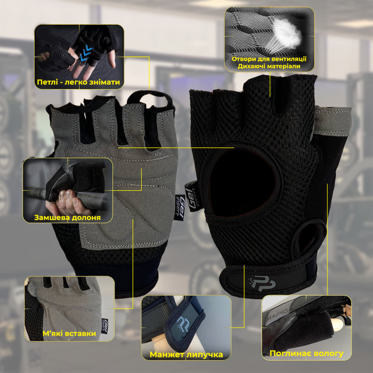 ЗРУЧНІ ДЛЯ НОСІННЯ: регульований манжет забезпечуэ комфортну посадку. Довжина ½ пальця покращує контакт із грифом штанги, гантелями та ін.