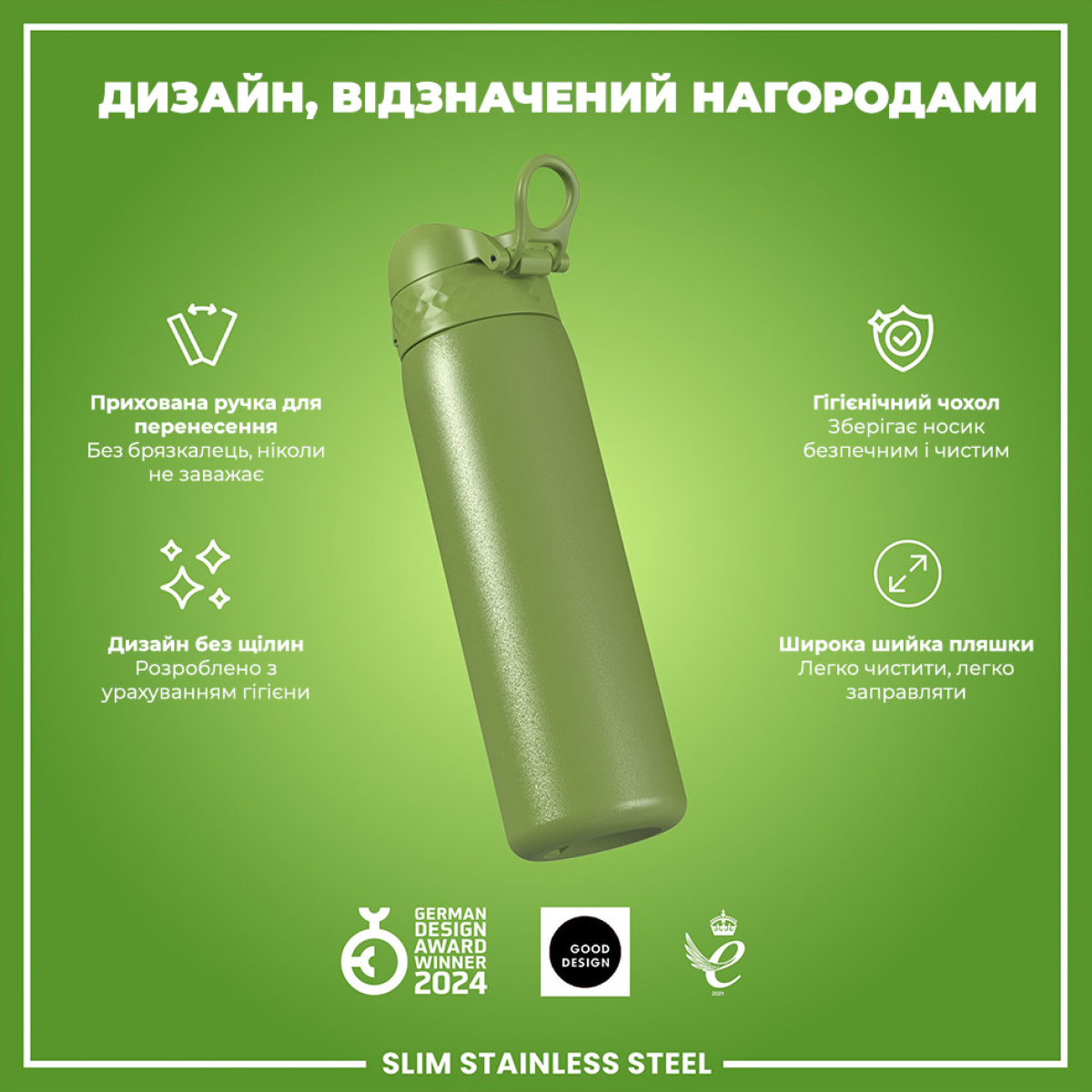 Пляшка для води металева ION8 600 мл. Stainless Steel , Khaki Green