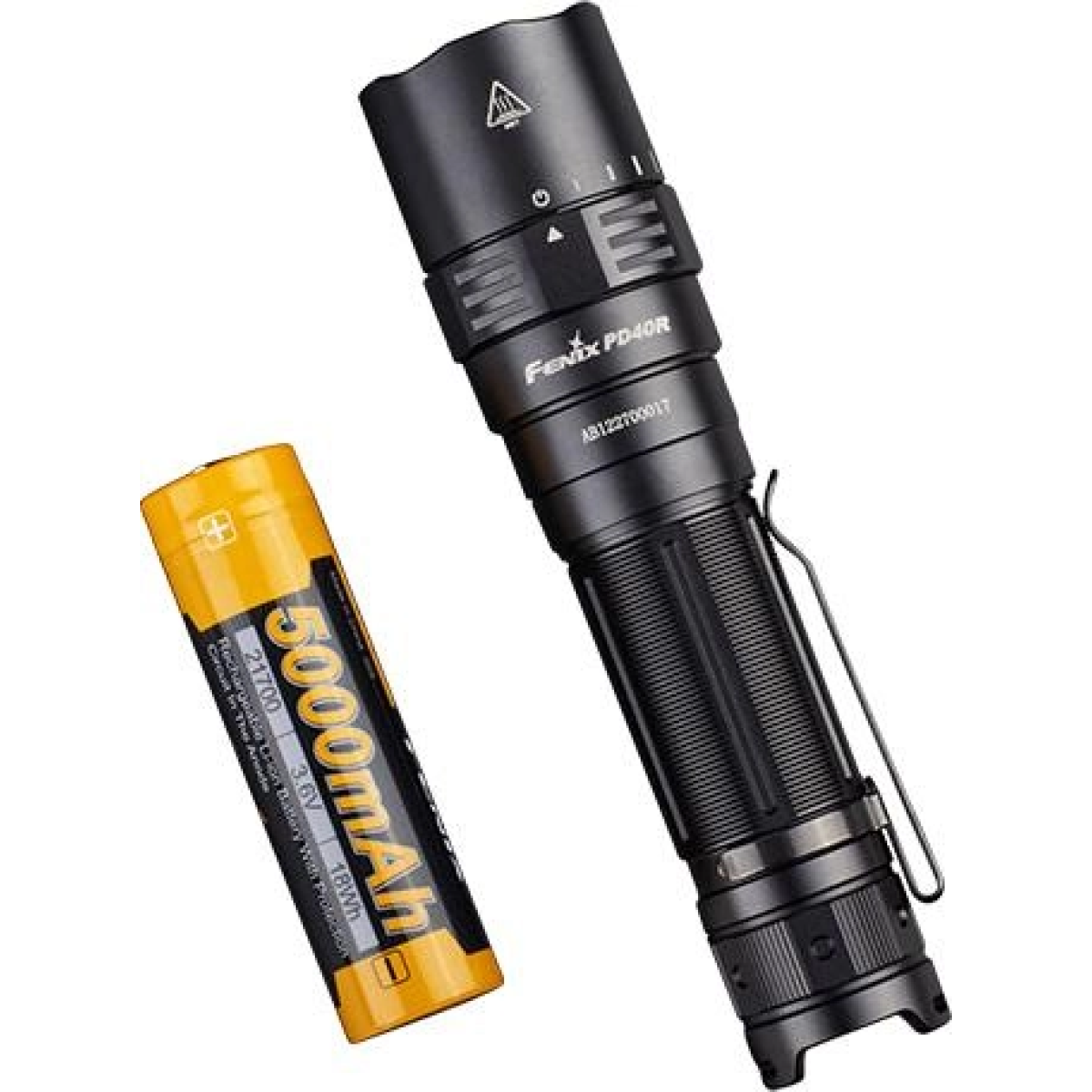 Модель ліхтарі Fenix PD40 V2.0, батарейка ARB-L21-5000 21700 літій-іонна, кабель для зарядки USB Type-C, ремінь, чохол, запасне кільце, керівництво користувача, гарантійний талон.