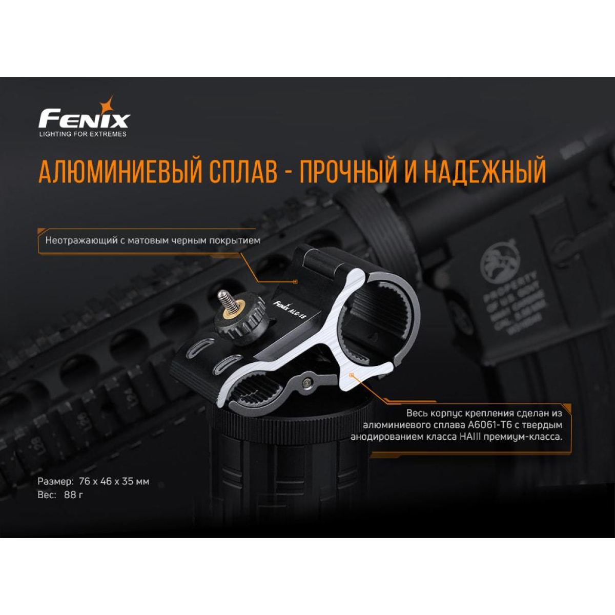 Кріплення можна швидко встановити на ствол зброї і так само швидко його зняти. Воно сумісно зі стволами різного розміру, що робить його більш універсальним і комфортним. На затиску є гумова прокладка, щоб уникнути подряпин і ефективно протистояти зовнішньому впливу, одночасно збільшуючи стабільність. Є антиблікове покриття з матовим чорним покриттям, що оптимально для тактичної маскування. При створенні Fenix ALG-18 застосовували алюмінієвий сплав а6061-Т6 разом з преміальним жорстким анодуванням. Даний матеріал і його обробка поверхні дають стійкість до пошкоджень, підвищують стійкість до зносу кріплення. В результаті воно буде служити довше користувачеві.
