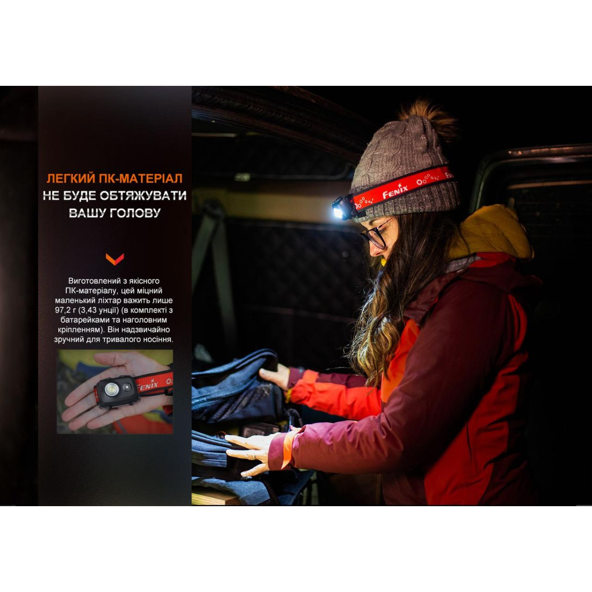 Опис налобного ліхтаря Fenix HL16, рожевого: Функціональний, надійний і надлегкий — це одні з головних якостей налобного ліхтаря Fenix HL16, розробленого для тих користувачів, які віддають перевагу активному способу життя. Основним світлодіодом, що використовується в моделі, є Luminus SST20. Це білий діод, який здатний генерувати освітлення яскравістю до 450 люмен у режимі Турбо і далекобійністю близько 104 метри. Можливості ліхтаря розширює додатковий світлодіод SMD 2835, що відповідає за червоне світло. Даний тип освітлення є оптимальним для використання на малих дистанціях, щоб підсвітити ближні об“єкти без ефекту засліплення оточуючих. Експлуатаційний термін обох діодів складає понад 50 тисяч годин. Ще один приємний бонус ліхтаря — можливість нахилу корпусу на 60°. Це дозволяє користувачу виставити комфортний кут освітлення, адаптувавши світло під власні потреби. Режими роботи Шість режимів роботи розділені на дві групи: чотири білих режими та два червоні. Біле освітлення Turbo: 450 люмен – 2700 кандел – 3 години – 104 метри; High: 150 люмен – 846 кандел – 8 годин – 58 метрів; Med: 50 люмен – 261 кандел – 27 годин – 32 метри; Low: 5 люмен – 24 кандел – 100 годин – 10 метрів. Червоне освітлення Постійне світло: 5 люмен – 10 кандел – 6 метрів – 100 годин; Миготливе світло (SOS): 5 люмен – 10 кандел – 6 метрів – 200 годин. Під час роботи конструкція ліхтаря поступово нагрівається, що є нормальним явищем. Якщо температура підвищується до 65°C, активується інтелектуальна система контролю, яка поступово знижує потужність світла для охолодження електроніки. Особливості керування Щоб позбавити користувача довгих натискань перемикача для виставлення необхідного режиму, виробник оснастив Fenix HL16 відразу двома кнопками. Вони виведені у верхню частину корпусу та керують різними групами режимів: права кнопка відповідає за увімкнення/вимикання ліхтаря та перемикання білих режимів, а ліва кнопка –—за увімкнення/вимикання ліхтаря та вибір типу освітлення червоного кольору. Активація білого світла: затискання правої кнопки на 0.5 секунди при вимкненому ліхтарі. Активація червоного світла: затискання лівої кнопки при вимкненому ліхтарі; Вимкнення освітлення: затискання будь-якої кнопки на 0.5 секунди при увімкненому ліхтарі; Зміна режиму: одноразове натискання правого (для білого світла) або лівого (для червоного світла) перемикача. У моделі є пам“ять останнього режиму та функція електронного блокування, що вмикається затисканням одного або одразу двох перемикачів на 3 секунди. Визначити, що блокування спрацювало, можна за допомогою червоного світла, яке блимне 4 рази. Щоб розблокувати освітлювальний пристрій, потрібно натиснути та утримувати дві кнопки керування протягом 3 секунд. Червоне світло знову заблимає 4 рази, сигналізуючи про готовність ліхтаря до роботи. Детальніше дізнатися про особливості керування моделлю HL16 можна в інструкції, яка є у наборі. Джерело живлення Fenix HL16 живиться від трьох найпоширеніших батарей типу ААА. Це можуть бути як лужні батареї з номінальною напругою 1.5 В, так і одноразові Ni-MH 1.2 В. Майте на увазі, що Li-ion акумулятори 10440 несумісні з даною моделлю. Одночасно встановлювати у батарейний відсік можна тільки елементи живлення одного типу і бренду. В іншому випадку є висока ймовірність виникнення несправності ліхтаря. Щоб користувач міг увімкнути ліхтар відраз