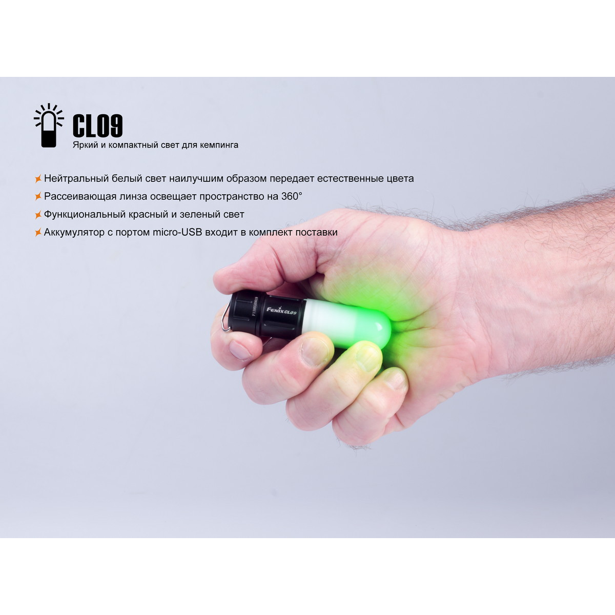Опис ліхтарі Fenix CL09: Модель Fenix CL09 призначена для всесезонного використання в кемпінгу. Цей ліхтар освітлення дає гарної якості, яке рівномірно розходиться відразу у всіх напрямках. Він обладнаний кількома діодами різного кольору: білого, червоного, зеленого. Всього ліхтар підтримує 7 режимів. Найяскравіший з них — це 200 люмен білого світла. Крім нього білий діод підтримує режими яскравості на 80, 30, 1 люмен, так що відповідне освітлення можливо вибрати в будь-якому випадку. Яскравість червоного і зеленого світла однакова і становить 5 люмен. Доступні режими постійного освітлення і миготливе червоне світло, який може використовуватися для подачі різних сигналів. У будь-якому з режимів світло розходиться відразу у всіх напрямках, оскільки ліхтар оснащений опуклою лінзою, що розсіює світло, зробленої з оптичного пластику. Діаметр території, яка освітлюється, становить 10 метрів. Вбудованої пам“яті в даній моделі ліхтаря немає і включається він кожен раз в режимі мінімальної яскравості білого світла. Для включення Fenix CL09 досить трохи повернути його головну частину. Поворот у зворотному напрямку вимикає ліхтар. Щоб змінити режим освітлення, потрібно швидко вимкнути і знову включити Fenix CL09. Після мінімального включаються в порядку зростання яскравості інші режими білого світла, після них — червоне світло, а останнім у циклі — зелений світло. Модель Fenix CL09 призначається для використання в будь-якому туристичному таборі. Вона підійде і для звичайного літнього кемпінгу, і для поїздок в гори або альпіністських сходжень. У зв“язку з цим, ліхтар може працювати на елементах живлення двох типів: 16340 і CR123A. Вони однакові за розмірами, але розрізняються по іншим характеристикам. Так, акумулятор формату 16340 ємністю 700 маг входить в комплект до ліхтаря. Він може служити до 500 циклів, постійно заряджаючись повторно. Час роботи акумулятора до розрядки становить 2-90 годин в залежності від того, який з режимів включений. У разі використання літієвої батарейки з основою, її енергії вистачить на 6-150 годин роботи. Крім того, даний тип батарейок не боїться холоду і навіть під час морозів продовжують працювати так само ефективно. Ліхтар Fenix CL09 отримав дуже надійний корпус. Він зроблений з авиаалюминия, не схильного до іржавіння. Деталі настільки старанно підігнані один до одного, що ліхтар є повністю водонепроникним і навіть на глибині двох метрів без проблем пропрацює до півгодини. Носити цей ліхтар можна просто в кишені, як брелок (для цього є металеве кільце), кріпити його за допомогою вбудованого магніту до металевих предметів або ж ставити торцем на рівну поверхню.