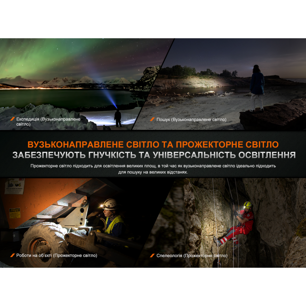 Опис налобного ліхтаря Fenix HM75R SE: Модель Fenix HM75R SE є спрощеною версією ліхтаря Fenix HM75R. Вона має ту саму функціональність з широким набором режимів, але поставляється в комплекті з 1 акумулятором замість кількох. Це дозволяє придбати один із найінноваційніших ліхтарів в асортименті Fenix за більш доступною ціною (за необхідності можна купити додатковий акумулятор окремо). У ліхтар вбудовані 4 світлодіоди: 1 х Luminus SST40 (6500К), 2 х Luminus SST20 (4000К) та 1 х OSRAM GR QSSPA1.23 (червоний). Вони знаходяться під надміцними лінзами з японського пластику PC-1250Z. До ключових особливостей моделі належить інтелектуальна система зниження яскравості світла. Технологія передбачає миттєве зниження яскравості у разі наближення ліхтаря до освітлюваного предмета ближче ніж 60 мм. У такий спосіб можна уникнути загоряння технічних рідин та інших легкозаймистих речовин під час впливу потужного променя, а також запобігти негативному впливу освітлення на зір людини. Режими роботи та особливості керування Інтерфейс складається з 3 груп режимів, у кожній по 4 варіанти освітлення. Далекобійне світло Турбо: 1600 лм – 223 м – 1 год 30 хв – 12448 кд; Високий: 800 лм – 158 м – 3 год 30 хв – 6262 кд; Середній: 350 лм – 101 м – 11 год – 2559 кд; Низький: 50 лм – 39 м – 50 год 50 хв – 383 кд. Ближнє освітлення Турбо: 1000 лм – 60 м – 1 год 50 хв – 1071 кд; Високий: 400 лм – 43 м – 4 год – 432 кд; Середній: 150 лм – 25 м – 8 год – 163 кд; Низький: 5 лм – 5 м – 100 год – 10 кд. Червоний промінь Високий: 120 лм – 16 м – 5 год 20 хв – 70 кд; Середній: 30 лм – 9 м – 32 год – 20 кд; Низький: 5 лм – 4 м – 110 год – 4 кд; Миготливий: 5 лм – 220 год. Зверніть увагу! У ліхтарі є захист від перегріву, який активується у випадку, якщо модель нагрівається до 60°C під час тривалої роботи на режимах із найвищою яскравістю. В результаті потужність світла знижується, щоб дати внутрішній електроніці час на охолодження. Керування засноване на металевому поворотному перемикачі (вибір групи режимів) та центральній кнопці (зміна яскравості променя). Джерело живлення Ліхтар Fenix HM75R SE поставляється з li-ion акумулятором ARB-L18-3400, який не має «ефекту пам“яті» та стабільно живить освітлювальний пристрій навіть у разі температурних перепадів. Елемент живлення заряджається через порт USB Type-C, вбудований у бокову сторону корпусу ліхтаря та захищений заглушкою. Кольоровий індикатор дозволяє відстежувати кількість заряду. Комплект можна доповнити другим акумулятором типорозміру 21700, який поміщається у виносний блок. Фізичні параметри Корпус виготовлений з магнієвого сплаву. Він характеризується стійкістю до іржі та легкістю, знижуючи вагу ліхтаря до 134 г. До того ж метал може похвалитися еталонною ударостійкістю, що робить модель несприйнятливою до ударів при падінні з висоти 2 м. Корисний бонус — максимальний захист оболонки від пилу та вологи (IP68), завдяки чому пристрій можна використовувати у вологому середовищі та навіть вмикати після 4-годинного занурення у воду на глибину до 2 м. Розміри корпусу становлять 91,1 х 41 х 53,5 мм. Налобне кріплення зі світловідбивними елементами є в комплекті. Воно адаптоване під фіксацію на голові та на захисному шоломі з можливістю зміни довжини резинок за допомогою регуляторів. Комплектація Ліхтар Fenix HM75R з налобним кріпленням, li-ion акумулятор ARB-L18-3400, зарядний кабель USB Type-C, запасне ущільнювальне кільце, гарантійний талон, інструкція користувача. Характеристики: нало