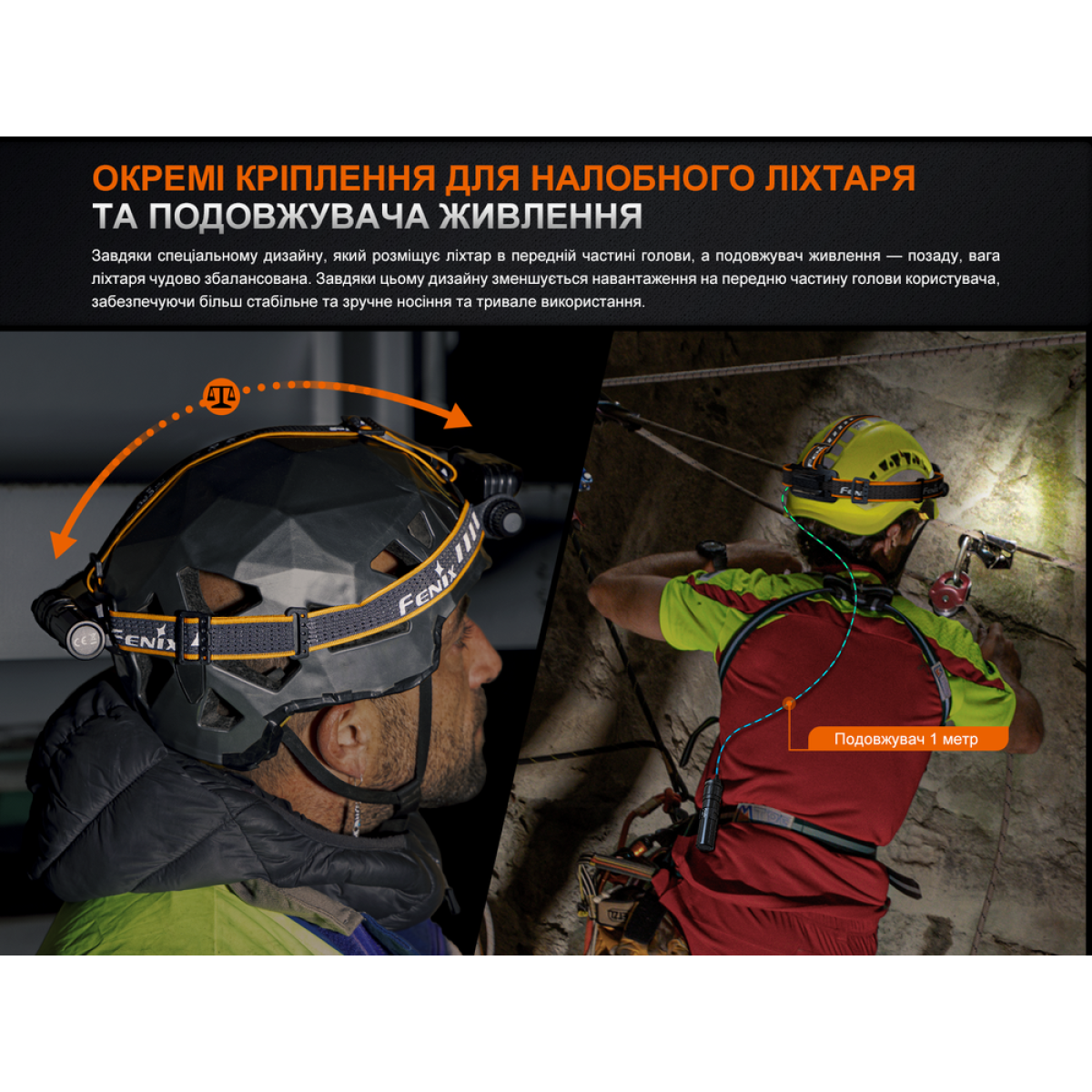 Дизайн продуманий таким чином, щоб вага між корпусом ліхтаря та допоміжним джерелом живлення була максимально збалансованою. Це сприяє комфортному носінню.