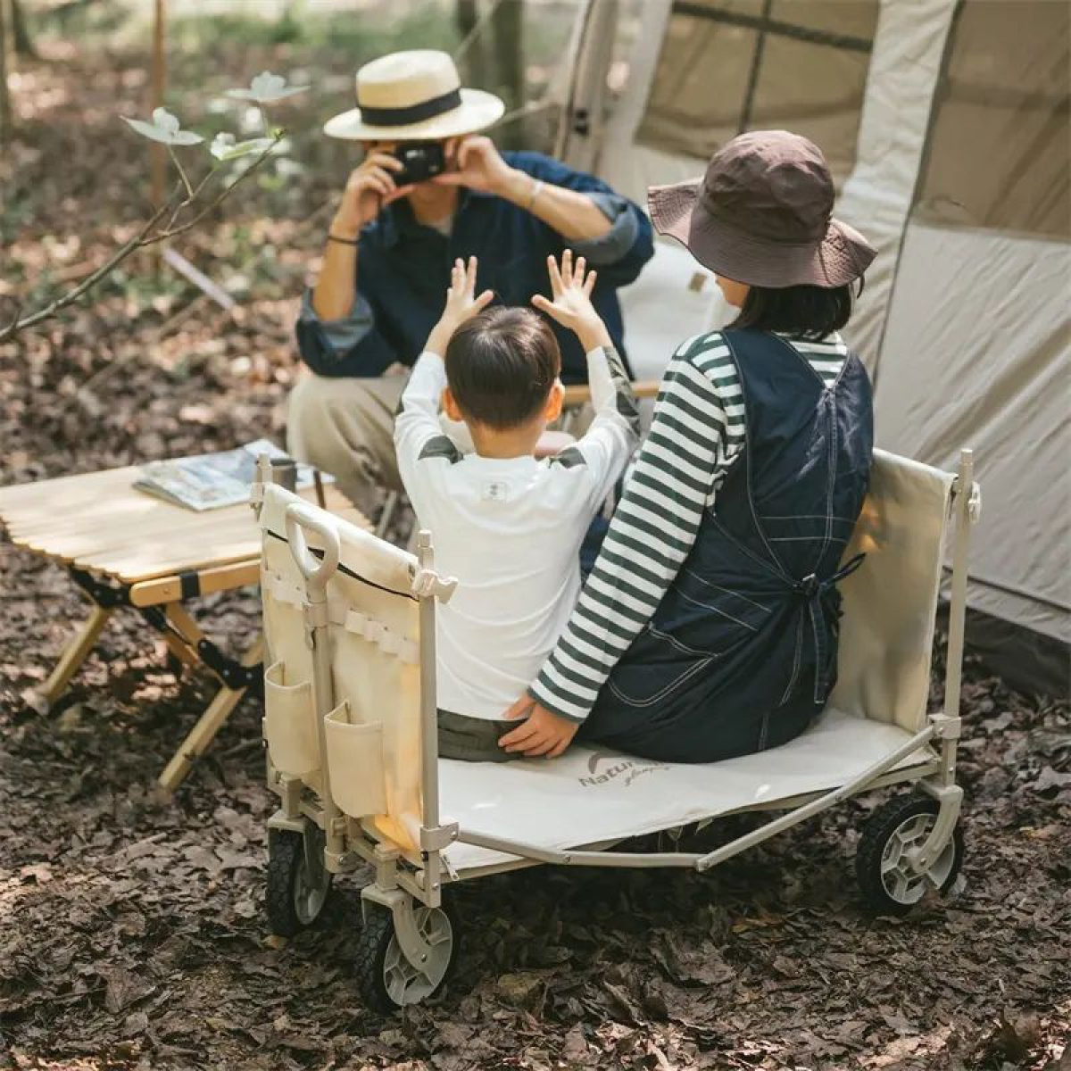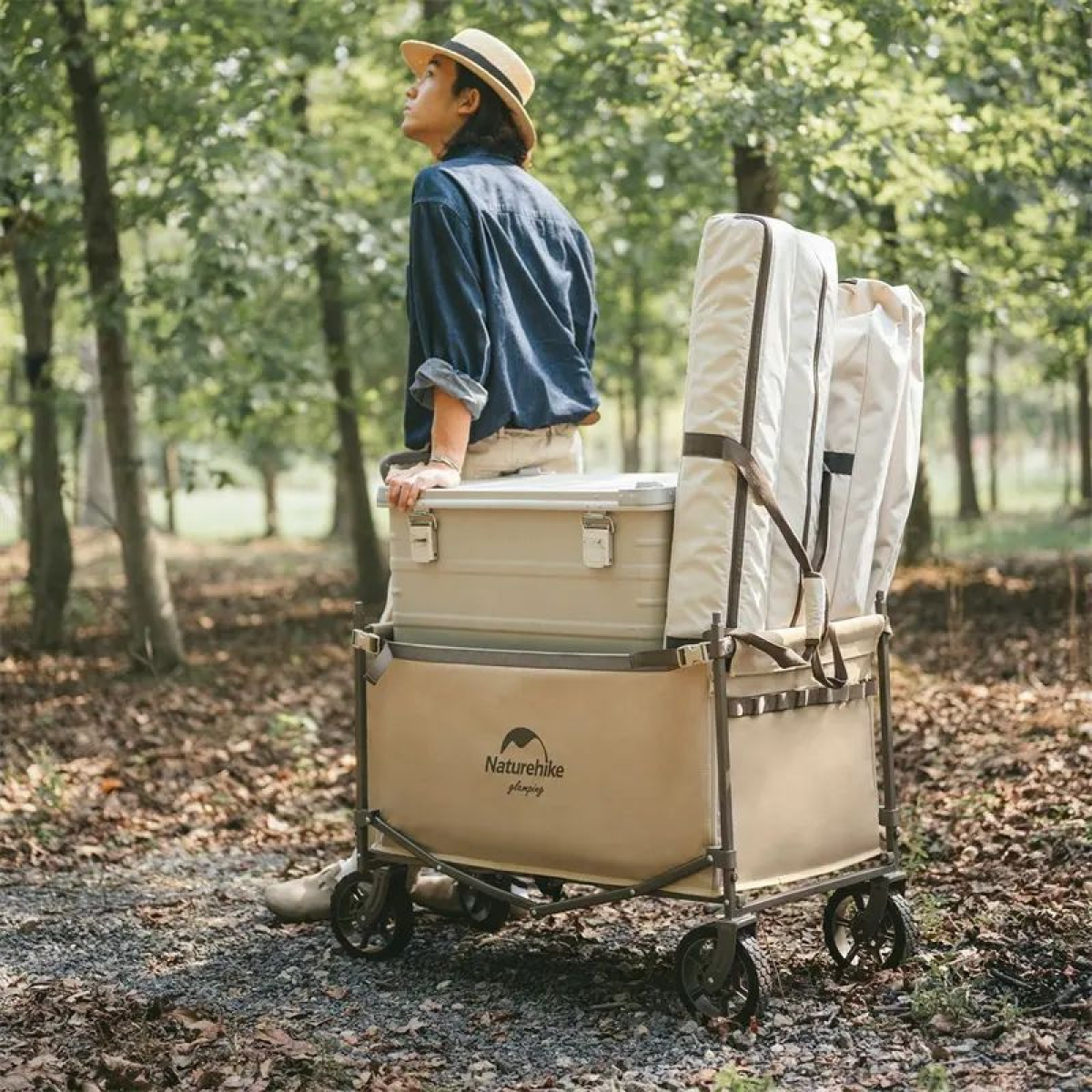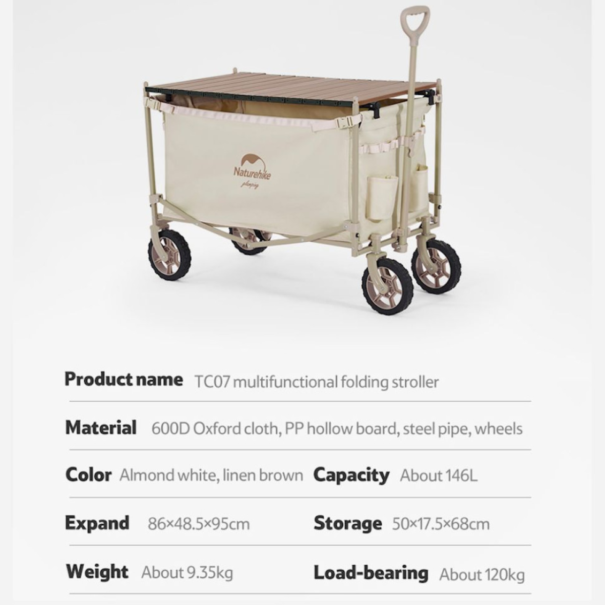 Портативний візочок Naturehike місткістю близько 146 літрів підходить для любителів кемпінгів і пікніків на природі. Завдяки продуманій конструкції модель можна використовувати не тільки як звичайний візок, але й трансформувати в полицю для зберігання речей або мініатюрний столик з поліпропіленовою стільницею (купується окремо).