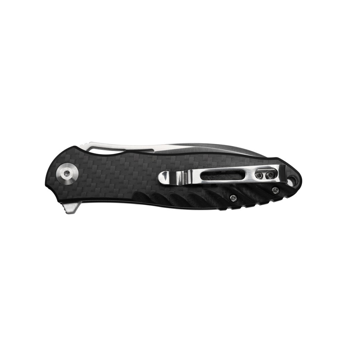 Форма леза Drop Point. Це досить популярний тип леза, нерідко він зустрічається серед ножів, особливо ефективний для застосування в полюванні. Ніж з типом клинка Drop Point однаково добре проявляє себе в процесі різання і наколювання. Що до матеріалу рукояті, то в її основі лежить надійне вуглецеве волокно, що відрізняється відмінною міцністю. Також це дуже стійкий до зносу і механічних впливів компонент. З його використанням інструмент стає по-справжньому довговічним, витривалим і захищеним від зовнішніх впливів.