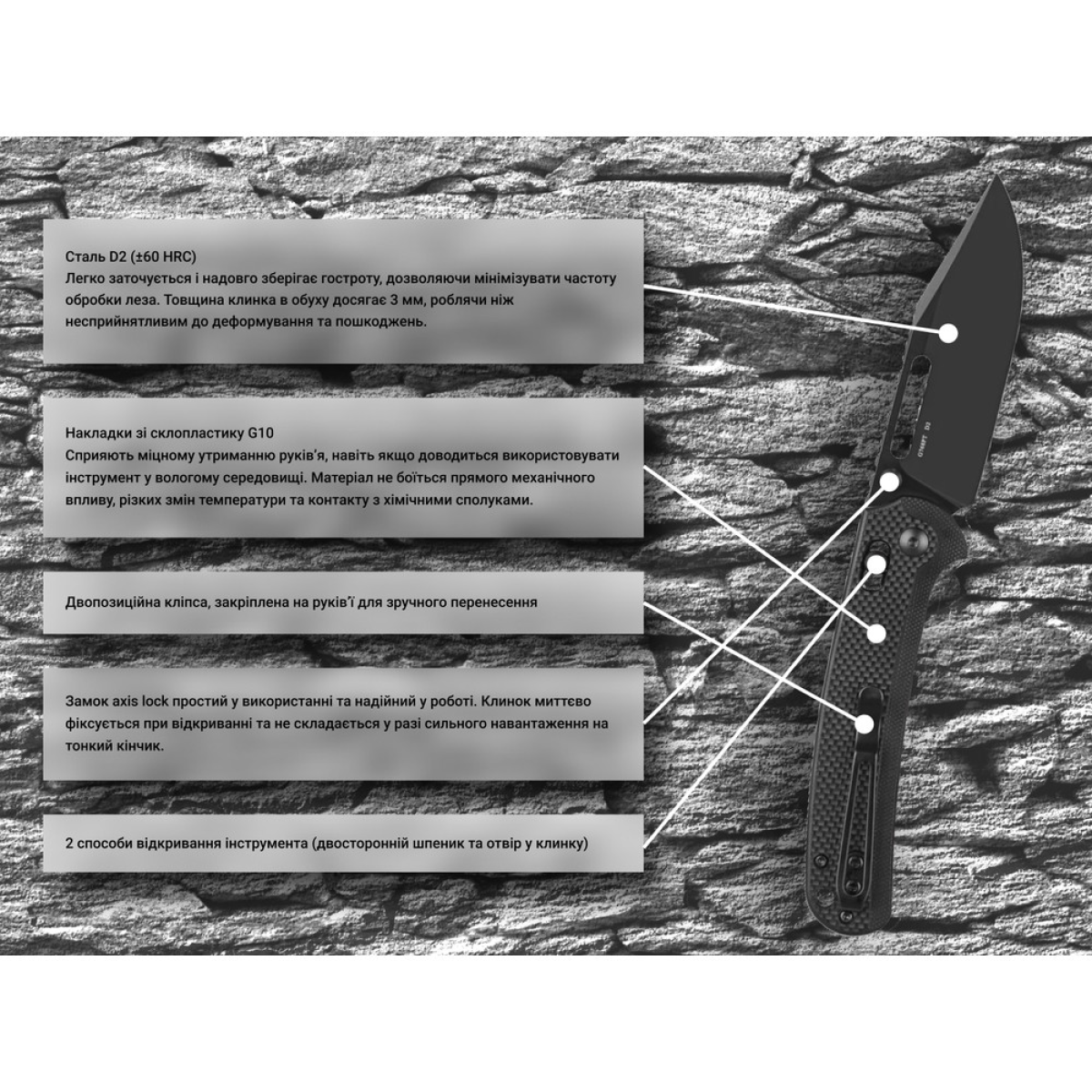 Сталь D2 в клинку легко заточується та надовго зберігає гостроту, дозволяючи мінімізувати частоту обробки леза. Товщина клинка в обуху сягає 3 мм, роблячи ніж несприйнятливим до деформування та пошкоджень.