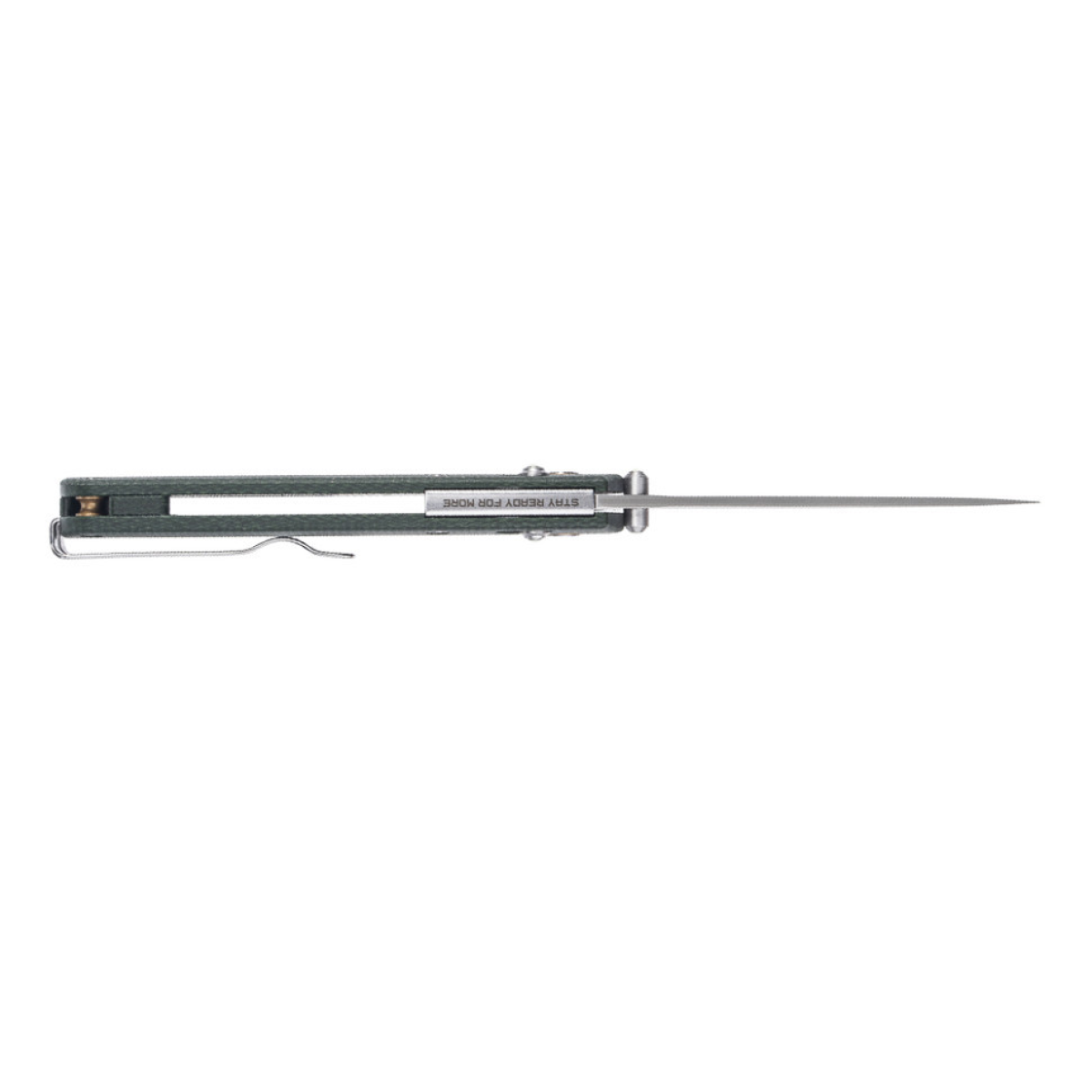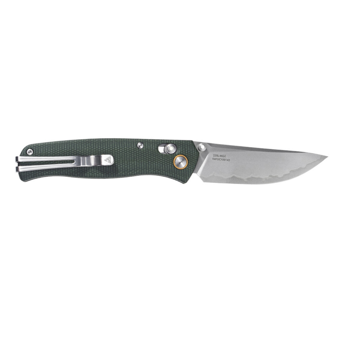 Опис складаного ножа SRM Medal 255L-MG2, темно-зеленого: Кишеньковий ніж Medal 255L-MG2 від SRM має акуратний дизайн без зайвих деталей. Суворі лінії, тонкий силует та скромна вага 70 г дозволяють носити модель щодня, не обтяжуючи кишеню. Загальна довжина при відкритті 191 мм з довжиною клинка 82 мм дає відмінний баланс між контролем і якістю різання. Товщина 2.6 мм в обуху робить клинок стійким до деформацій у разі високих навантажень. Профіль Drop Point поєднує міцне «робоче» вістря та довгу кромку з прямим заточуванням. Ця форма вважається найуніверсальнішою в роботі та найпростішою в обробці. Особливості матеріалів ножа SRM Medal 255L-MG2: Клинок зі сталі 140Cr. Сталь сімейства 140Cr характеризується передбачуваним заточуванням та «чистим» різанням. Ламінування двома шарами інших нержавіючих сталей допомагає довше утримувати гостроту при регулярному використанні. Фініш Bead Blast (дробоструминна обробка) створює матову поверхню, яка візуально приховує дрібні сліди експлуатації. Накладки на руківʼї з мікарти. Це багатошаровий композит з тканини та смоли. Він легкий, жорсткий та стійкий до вологи, перепадів температур та зношування. Шорстка поверхня дає «сухий» хват без ковзання. Для швидкого відкривання ножа передбачено двосторонній шпеник — з ним зручно взаємодіяти як правою, так і лівою рукою. Відкриття чітке та плавне завдяки підшипникам з кераміки, які знижують тертя. За фіксацію відповідає замок Ambi-Lock (Crossbar Lock). Фірмова рама Mono-Chassis Liner підвищує загальну жорсткість конструкції для стійкості під час виконання особливо складної роботи із застосуванням сили. На руківʼї є сталева кліпса з можливістю перевстановлення на будь-який бік інструмента, щоб ви могли підлаштовувати її положення під власний стиль носіння та ведучу руку. Характеристики: колір – темно-зелений; профіль клинка – Drop Point; тип заточування – прямий; фініш клинка – дробоструминний (bead blast); сталь клинка – 140Cr з ламінуванням двома шарами нержавіючої сталі; спосіб відкриття – двосторонній шпеник; керамічні підшипники в осьовому вузлі; тип запірного механізму – замок Ambi-Lock (Crossbar Lock); матеріал руківʼя – мікарта; повна довжина – 191 мм; довжина леза – 82 мм; товщина в обуху – 2.6 мм; вага – 70 г.
