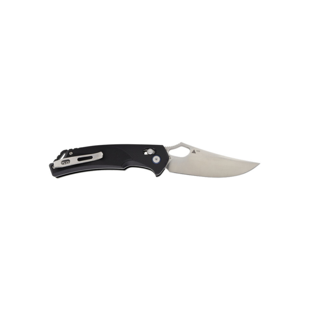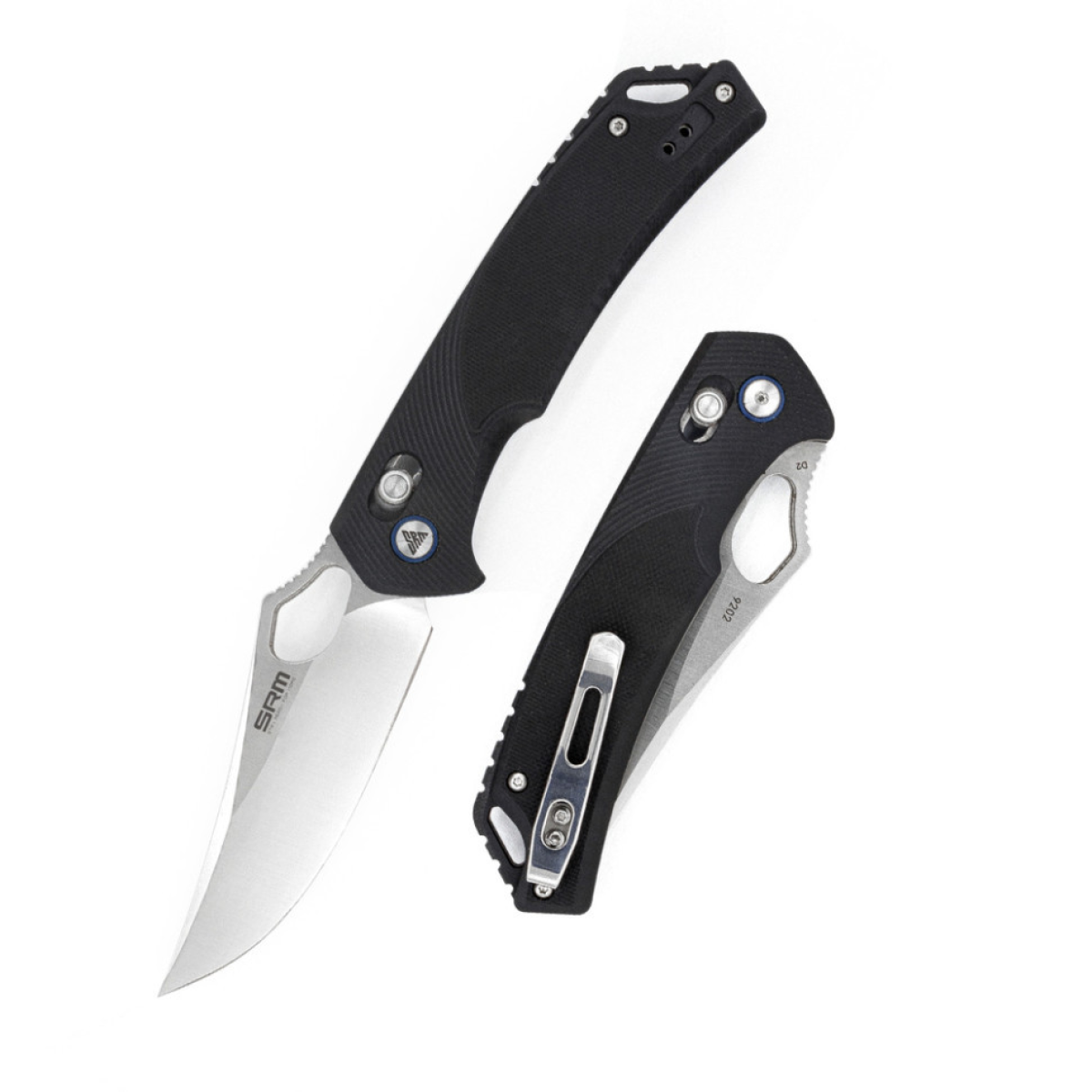 Опис складаного ножа SRM Retriever 9202, чорного: Серія ножів Retriever створювалася для завдань, де клинок повинен однаково впевнено різати та працювати на проколювання. Для цього інструменти оснащені агресивними лезами з геометрією Clip Point із тонким вістрям. Модель SRM 9202 сконструйована з акцентом на практичність для мисливців. На посиленому клинку завтовшки 3.1 мм лінія обуху біля основи трохи підіймається, формуючи зручний упор для пальця — актуально для виконання силового різання. Матовий Brush-фініш зменшує відблиски та візуально приховує сліди довгострокового використання, такі як відбитки пальців чи подряпини. Особливості матеріалів ножа SRM Retriever 9202: Клинок зі сталі D2. Напівнержавіюча інструментальна сталь D2 цінується за стійкість різальної кромки до навантажень та тривале утримання гостроти. Твердість металу сягає 59–61 HRC. Руківʼя G10 з лайнерами з нержавіючої сталі 420. Текстуровані плашки забезпечують міцний хват у вологому середовищі, щоб рука не ковзала по ножу під час роботи. Скошені кромки перешкоджають наминанню долоні, а неглибока виїмка під вказівний палець страхує хват для безпеки. Ніж відкривається за допомогою овального отвору в клинку, який потрібно підчепити пальцем. Вузол осі зібраний на сталевих підшипниках. Система фіксації Ambi Lock керується однією рукою та особливо зручна тим, що пальці під час закривання леза залишаються поза траєкторією гострої кромки. Для носіння передбачено двопозиційну сталеву кліпсу Tip-Up та наскрізний отвір під темляк для підстрахування або прикрашання. Характеристики: колір – чорний; профіль клинка – Clip Point; тип заточування – прямий; сталь клинка – D2; фініш клинка – Brush; твердість клинка – 59-61 HRC; спосіб відкриття – отвір у клинку; підшипники зі сталі в осьовому вузлі; тип запірного механізму – замок Ambi Lock (Crossbar Lock); матеріал руківʼя – G10 із вкладишами з нержавіючої сталі 420; повна довжина – 205.5 мм; довжина леза – 90 мм; товщина на обуху – 3.1 мм; вага – 98 г; є сталева двопозиційна кліпса та отвір для темляка.