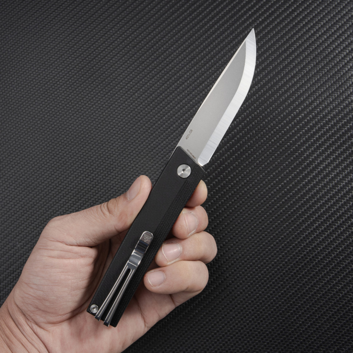 Шорстке руківʼя G10. Склотекстолітові плашки закріплені з обох боків руківʼя. Композит повсюдно використовується в кишенькових ножах, оскільки несприйнятливий до механічних пошкоджень, тримає форму у разі перепадів температури та не вбирає воду.
